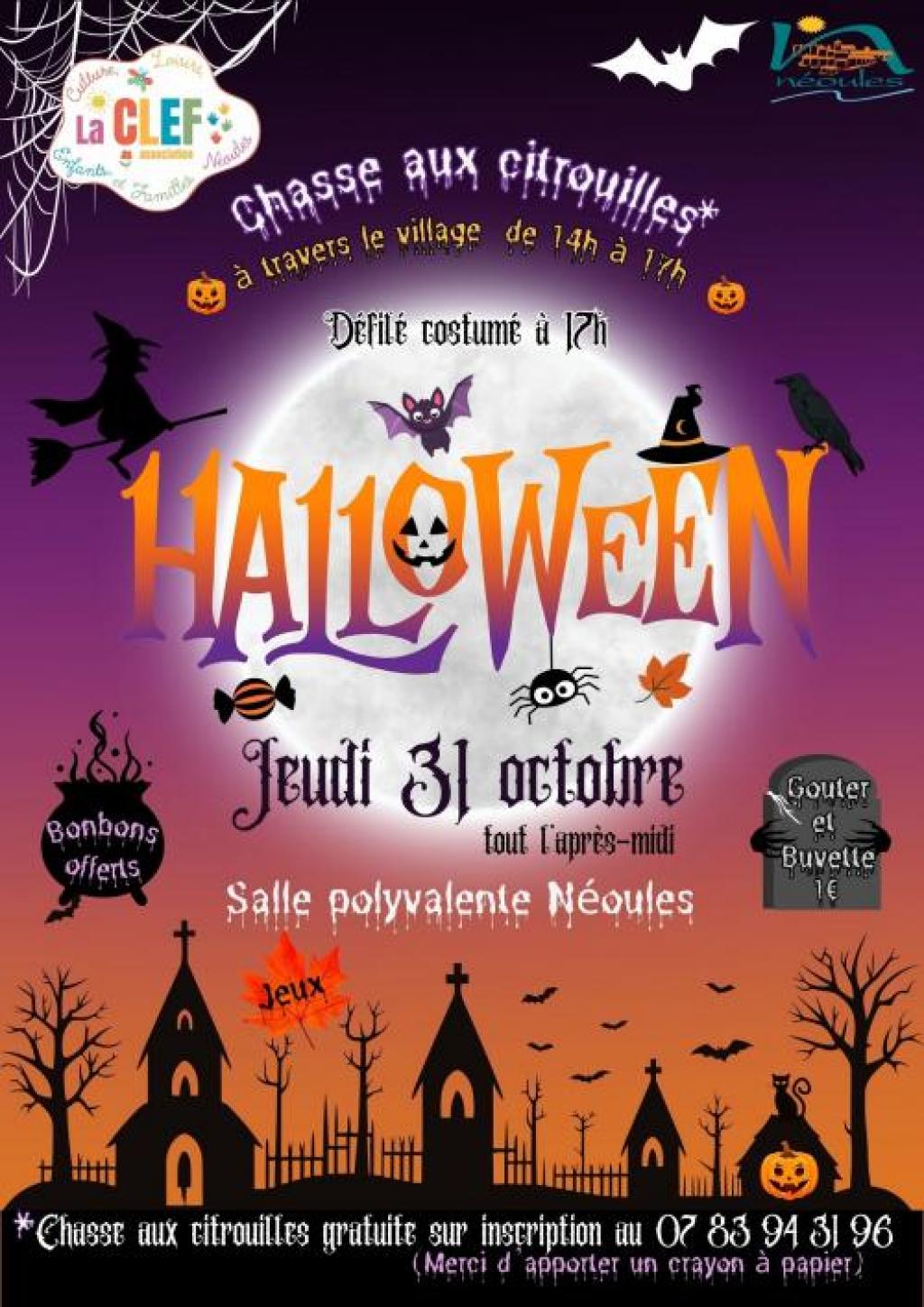 “ Venez passer une après-midi festive et déguisée avec des jeux, un goûter et une chasse aux citrouilles à travers le village pour la fête d'Halloween. ”