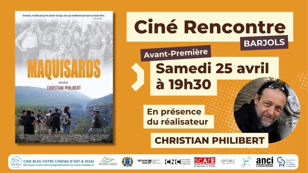 “ Ciné bleu vous invite à la projection du film "Maquisards", histoire tirée du journal de bord de Gleb Sivirine : le lieutenant Vallier. Projection suivie d’un temps de rencontre avec le réalisateur, Christian Philibert ”