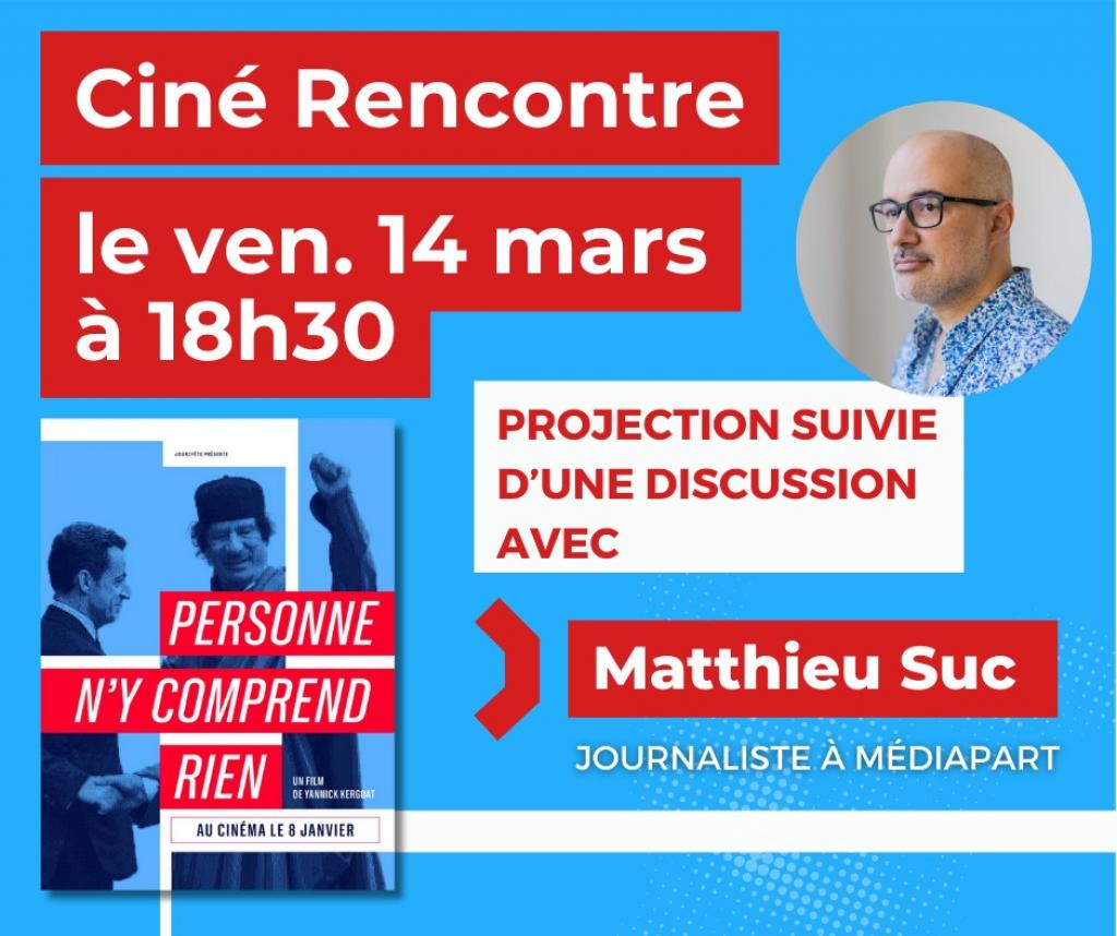 “ Ciné bleu vous invite à un Ciné-Rencontre avec la projection de « Personne n'y comprend rien » en présence du journaliste, Matthieu Suc. ”