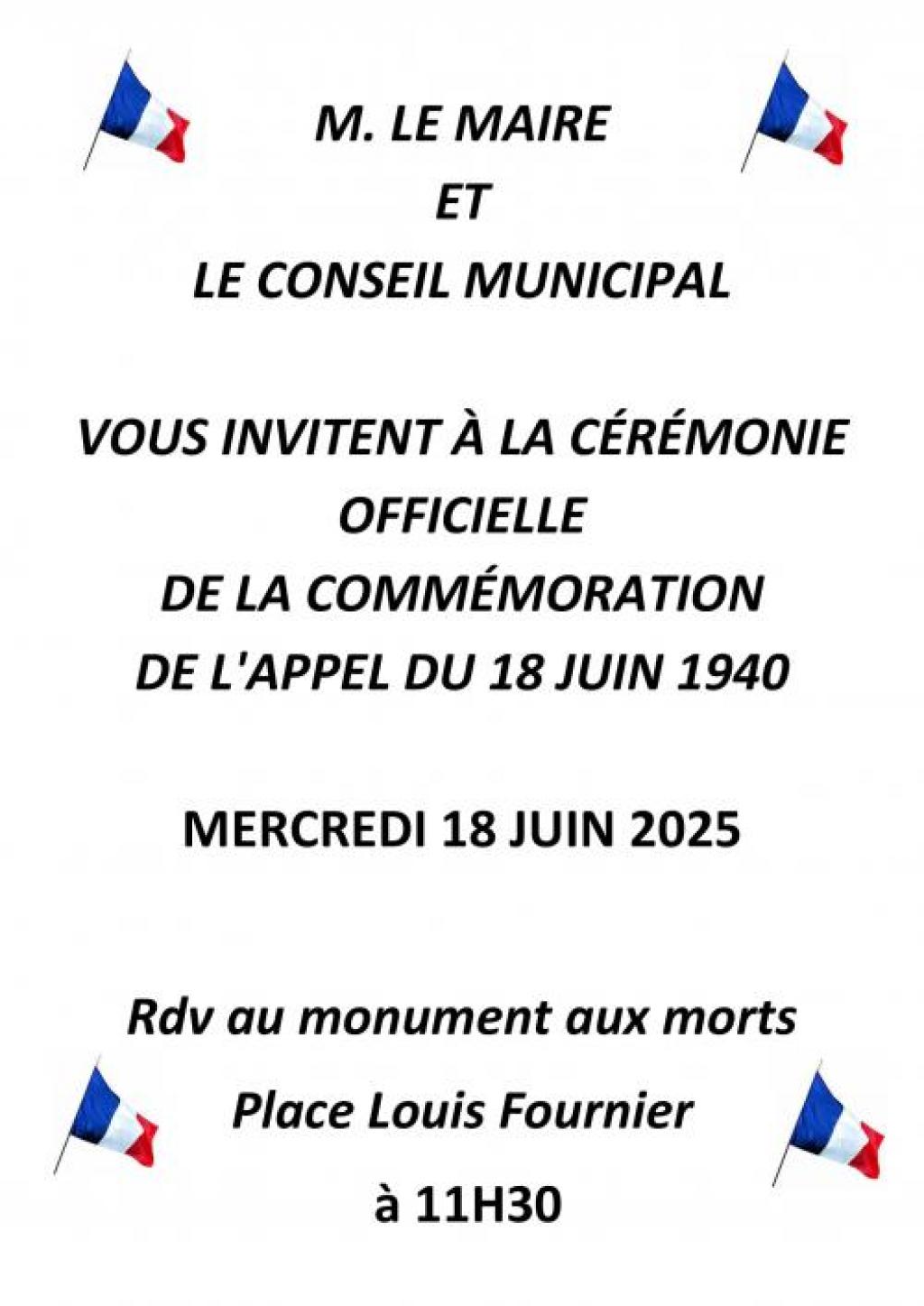 “ Monsieur le Maire et le conseil municipal vous invitent à la cérémonie officielle de la commémoration de l'appel du 18 juin 1940 ”