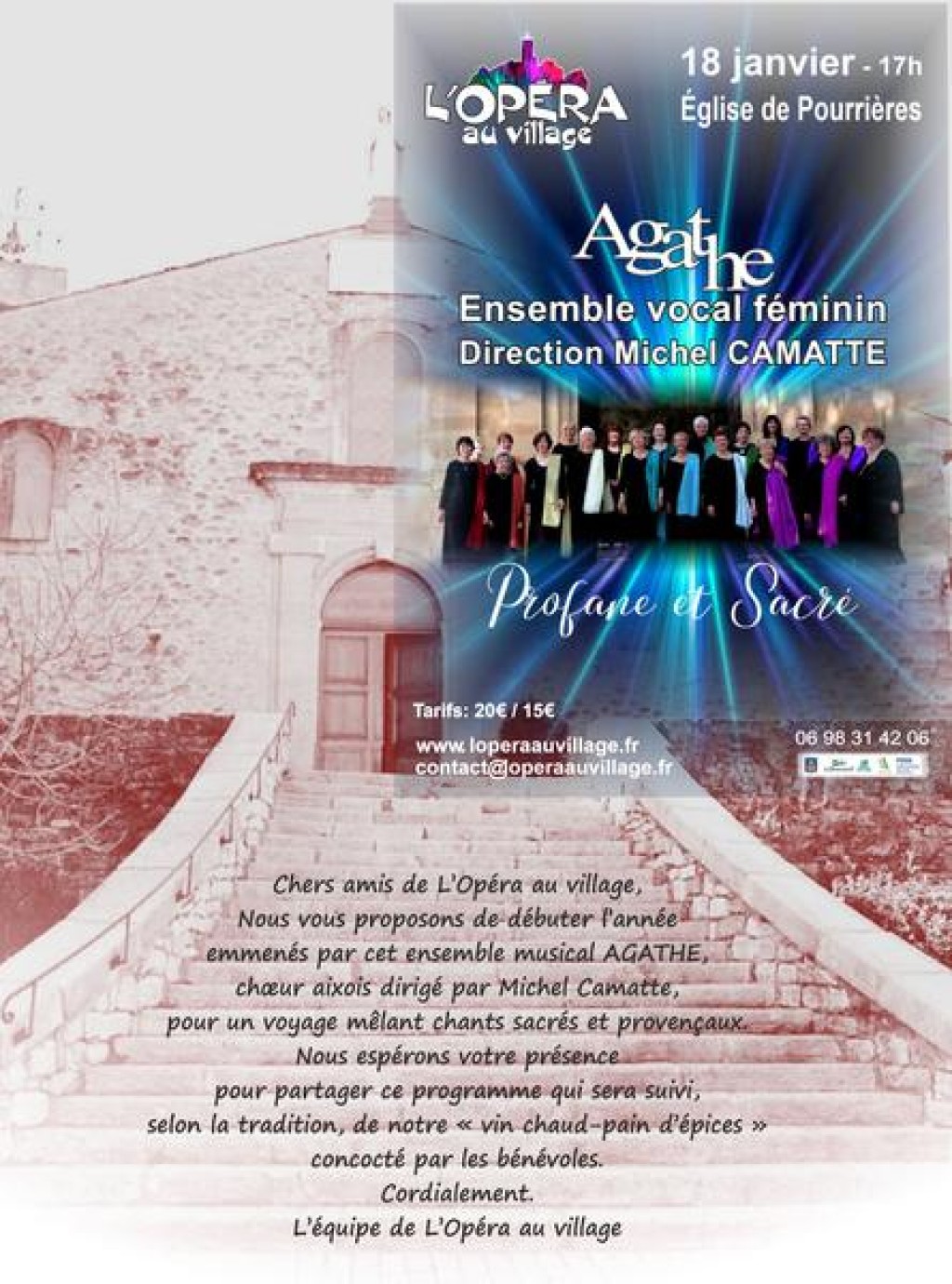 “ Nous vous proposons de débuter l'année emmenés par cet ensemble musical Agathe, chœur aixois dirigé par Michel Camatte, pour un voyage mêlant chants sacrés et provençaux. ”