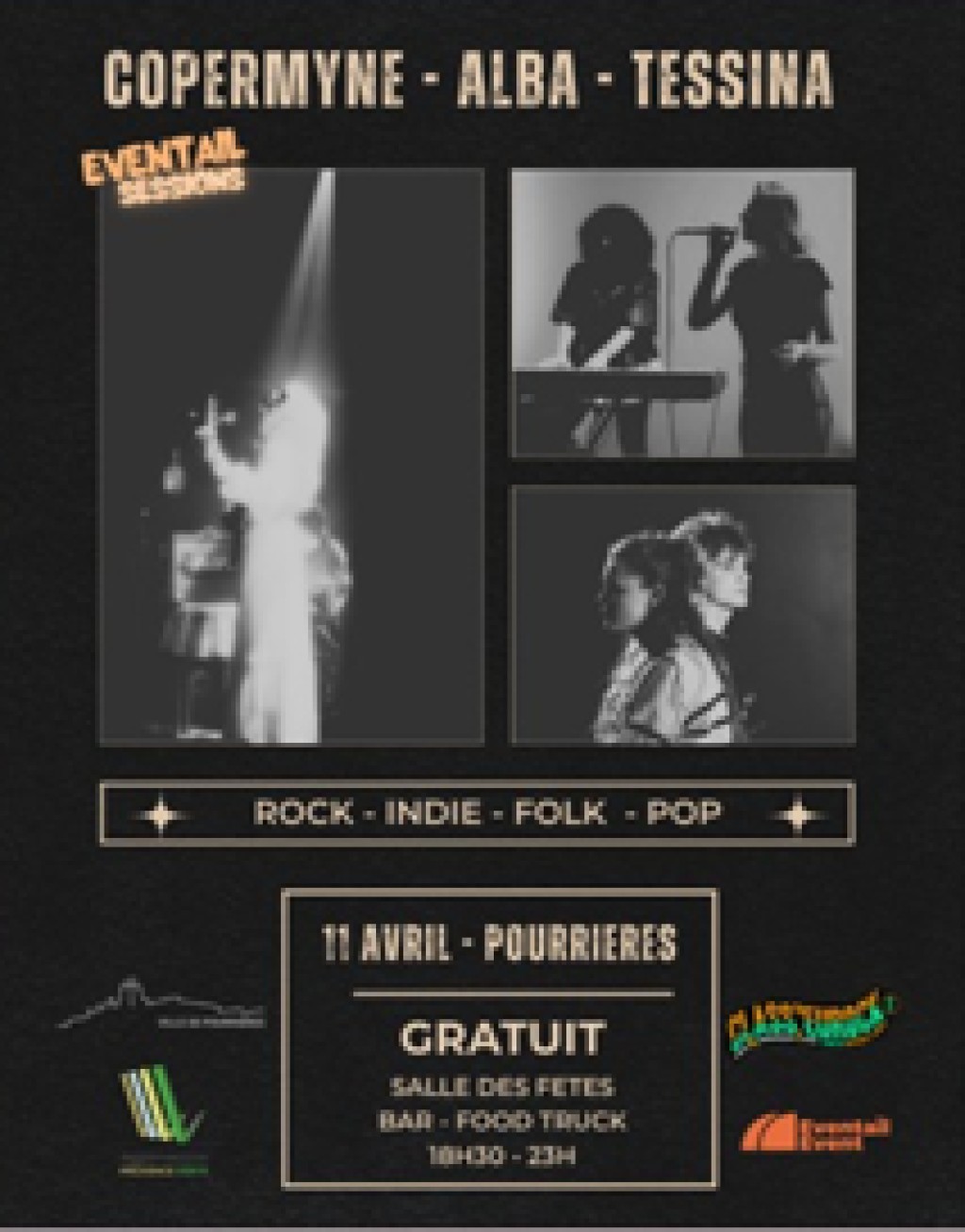 “ Trois concerts pour les amateurs de musique, esthétique rock indie folk pop et soul avec Copermyne, Alba et Tessina. ”