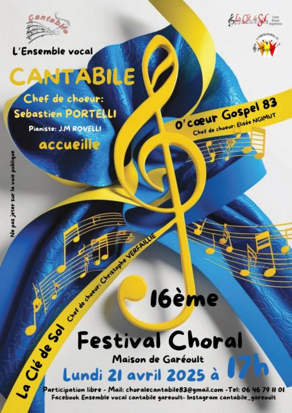 “ 16ème rencontre organisée par l'ensemble vocal Cantabile, (Chef de choeur, Sébastien PORTELLI - Pianiste, JM ROVELLI) avec la participation de O'coeur Gospel 83 (Chef de choeur, Elisée NGIMUT) et La Clé de Sol (Chef de choeur, Christophe VERFAILLIE) ”