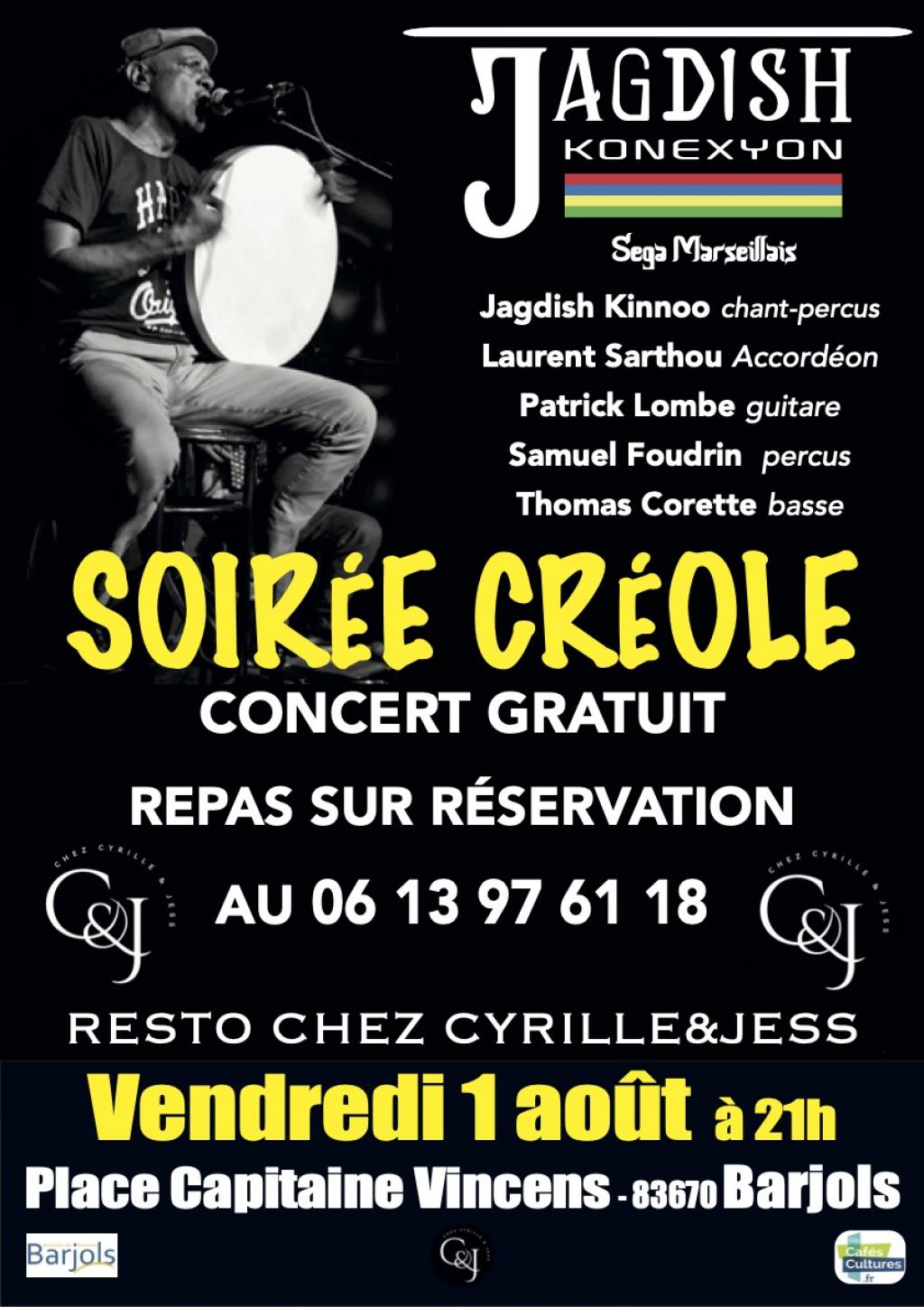 “ Soirée créole du coté de chez Cyrille et Jess et voyage direction les iles assuré par Jagdish konexyon, un séga marseillais avec percussions, guitares et basses. Repas sur réservation. ”