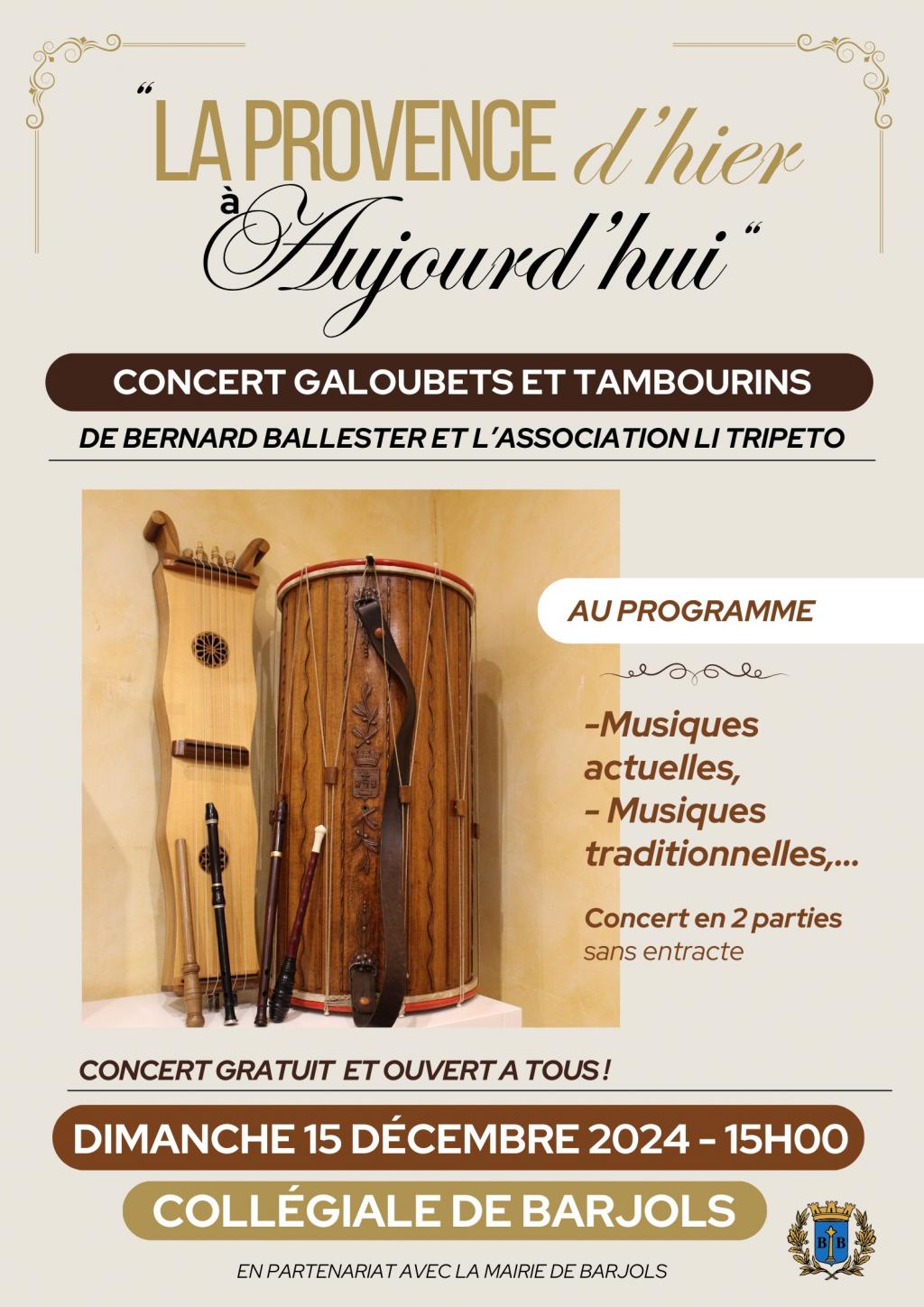 “ Concert de galoubets et tambourins mené par Bernard Ballester et l'association Li tripeto avec des musiques traditionnelles et actuelles ”