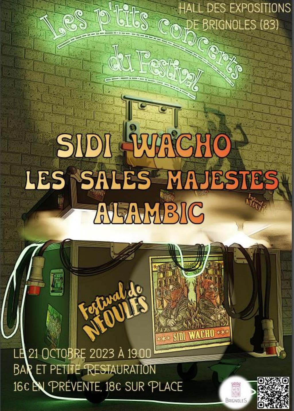 “ Concert de Sidi Wacho, Les Sales Majestés et Alambic. Bar et petite restauration. ”