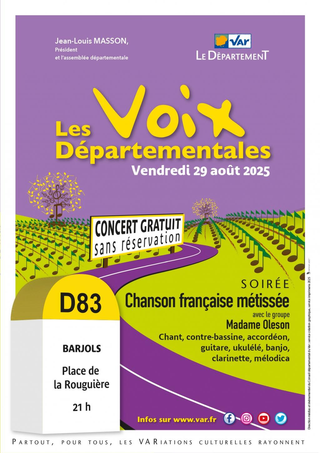 “ Chants, contre bassine, accordéon, guitare, ukulélé, clarinette, melodica et banjo s'invitent à Barjols pour les voix départementales. Redécouvrez les chansons emblématiques de notre répertoire version métissée. ”
