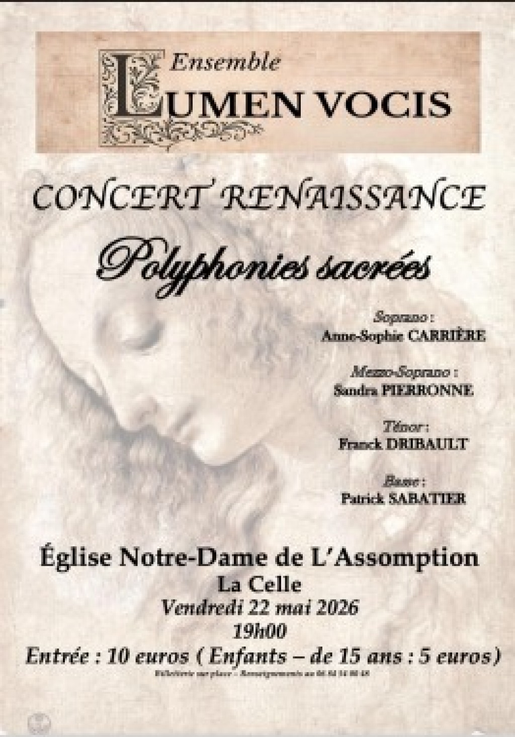 “ Concert de polyphonies sacrées avec l'ensemble Lumen Vocis, mettant en vedette Anne-Sophie Carrière (soprano), Sandra Pierronne (mezzo-soprano), Franck Dribault (ténor) et Patrick Sabatier (basse). ”