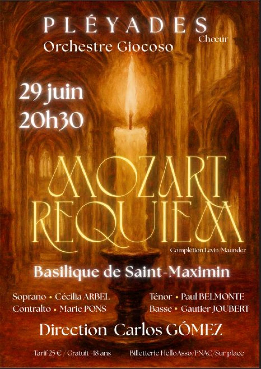 “ Un chef-d'oeuvre inachevé, revisité avec finesse et audace. Porté par les 52 choristes de Pléyades et les 25 musiciens de l'orchestre Giocoso, ce requiem résonnera dans l'écrin majestueux de la Basilique. ”