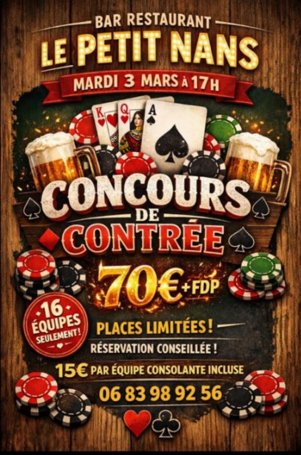 “ Une soirée chaleureuse et stratégique pour les amateurs de jeux de cartes dans une ambiance conviviale. Réservation conseillée. Seize équipes uniquement. Places limitées. Ouvert à tous ”
