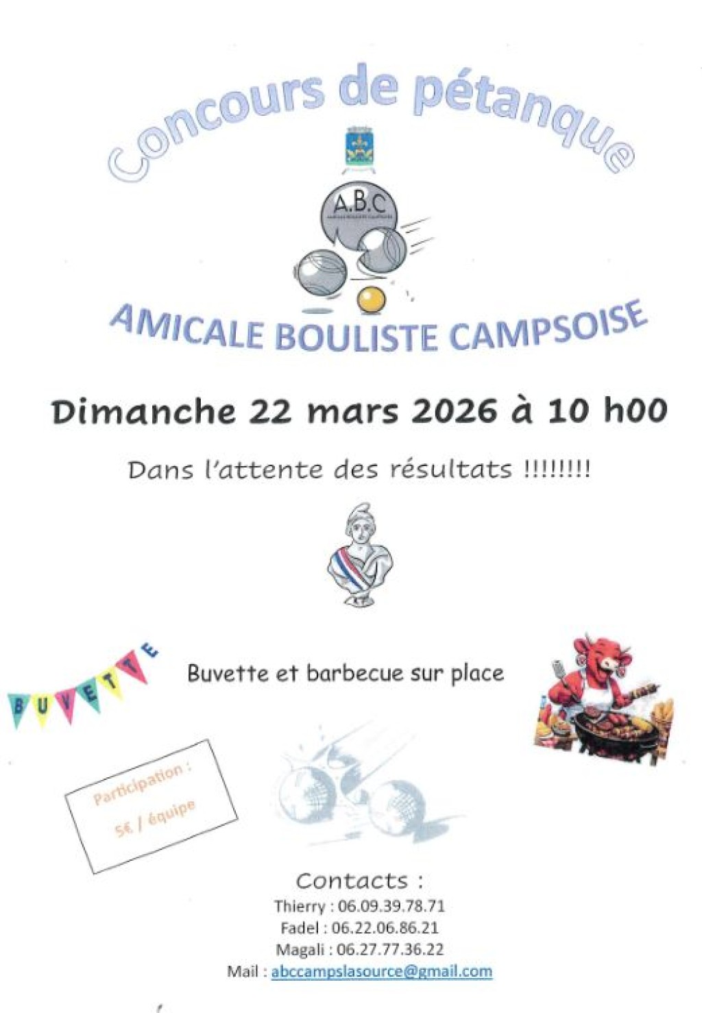 “ L'association Amicale Bouliste Campsois vous propose son concours de pétanque. Buvette et barbecue sur place. ”