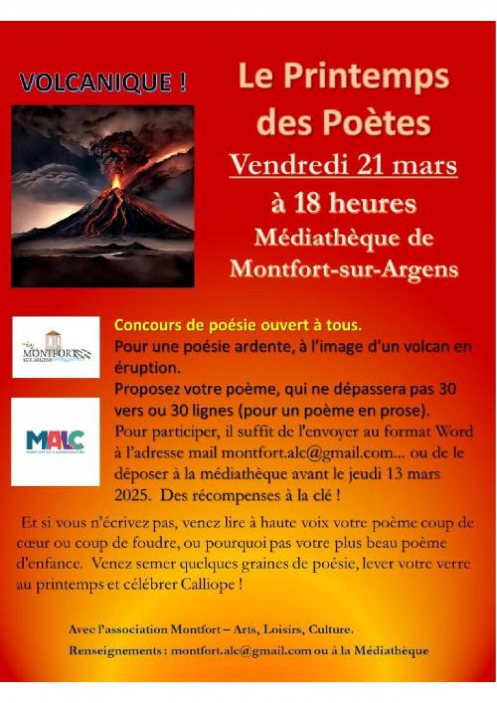 “ Proposez votre poème, qui ne dépassera pas 30 vers ou 30 lignes (pour un poème en prose). Déposez le à la médiathèque avant le jeudi 13 Mars ou adresse le par mail à la Médiathèque. Des récompenses à la clé. ”