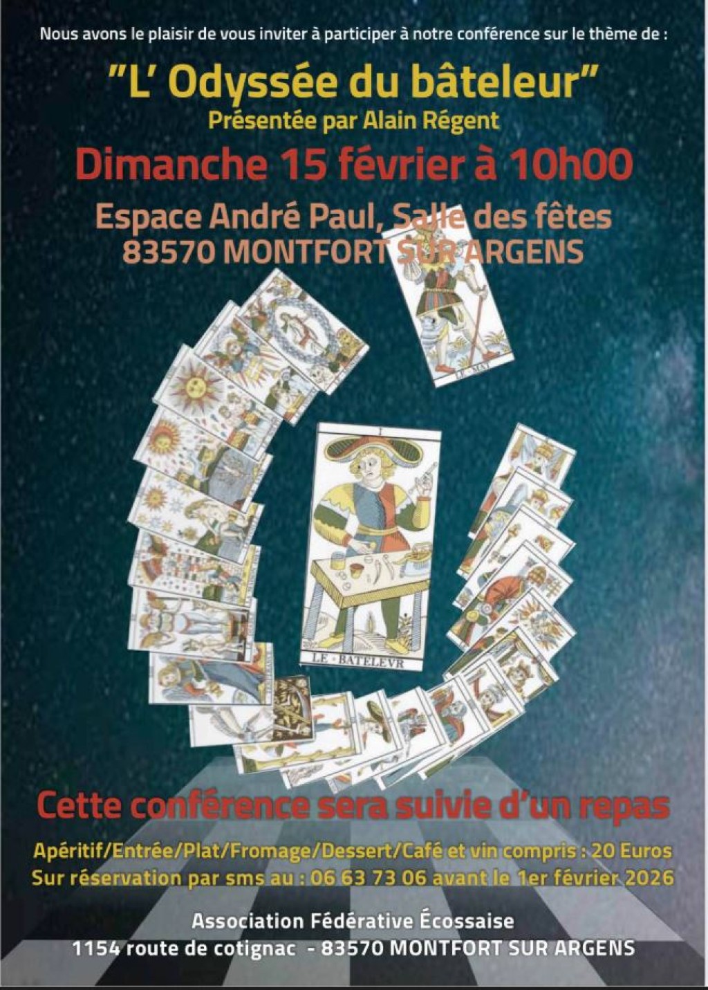 “ Une conférence présentée par Alain Régent, suivie d'un repas. Au menu : apéritif, entrée, plat, fromage, dessert, café et vin compris. ”