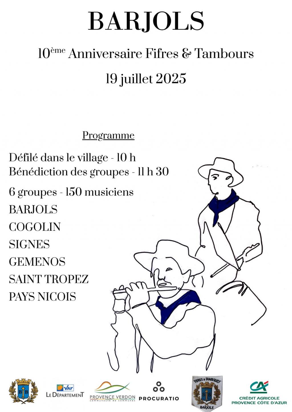“ A l'occasion de leurs 10 ans, suivez les fifres et tambours de Barjols et invités pour un défilé musical et bénédiction des musiciens. Immersion en Provence garantie. ”