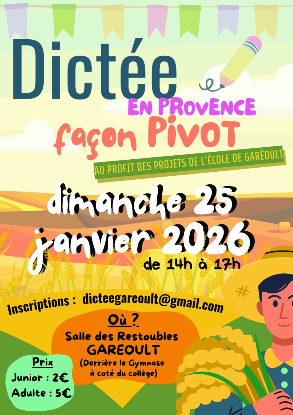Les professeurs de l'Ecole Elémentaire Pierre Brossolette vous invitent à soutenir de façon originale et ludique les projets éducatifs de l'école (classe de découverte, projet musique, etc.) avec une dictée en Provence accessible aux enfants et aux adultes et ouverte à tous.