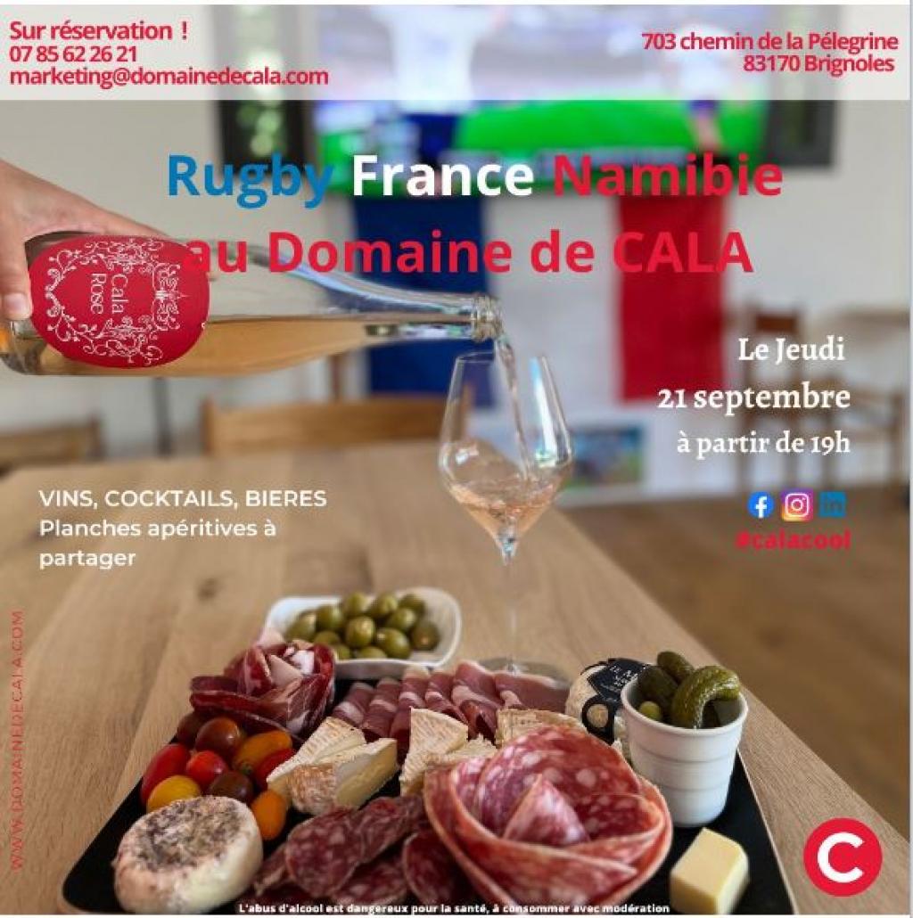 “ Le domaine de CALA vous annonce la diffusion du match France/Namibie. Planches apéritives à partager (fromages et charcuterie. Musique lounge bar. ”