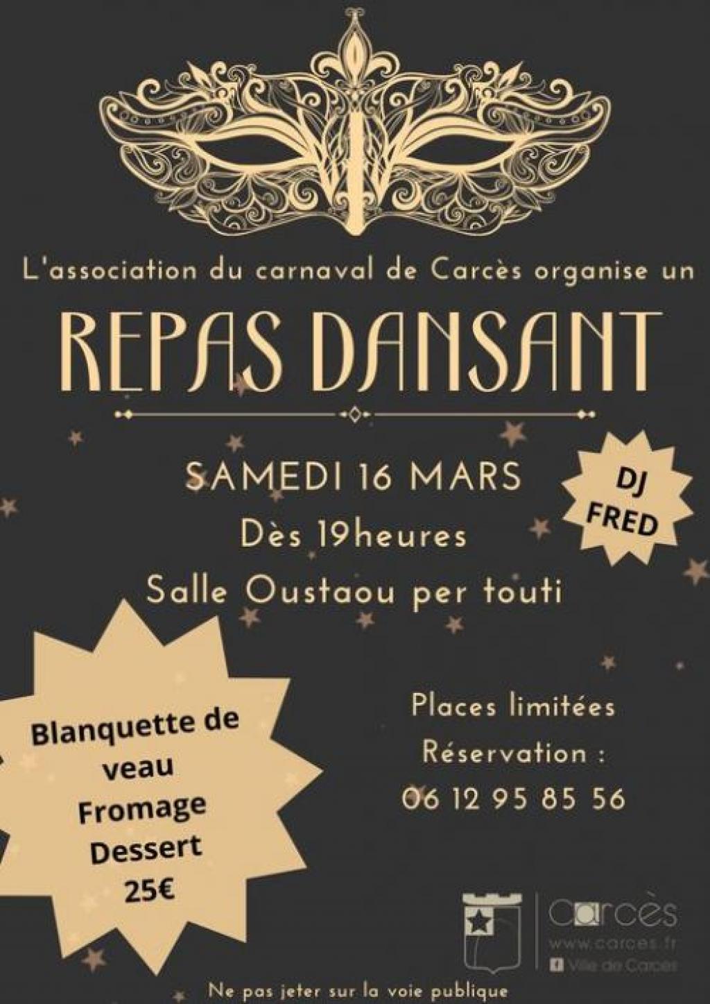 “ Grand repas dansant animé par DJ Fred . Au menu : Blanquette de veau, fromage, dessert ”