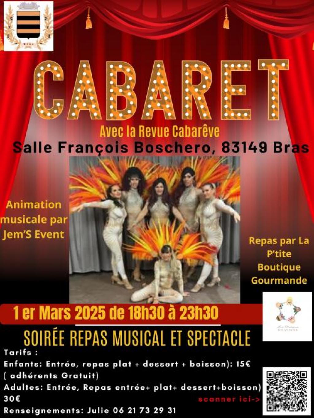 “ Une soirée avec une animation cabaret, avec la revue Cabarêve et un repas concocté par la p'tite boutique Gourmande (située à brignoles). Animation musicale menée par Jem's Event ”