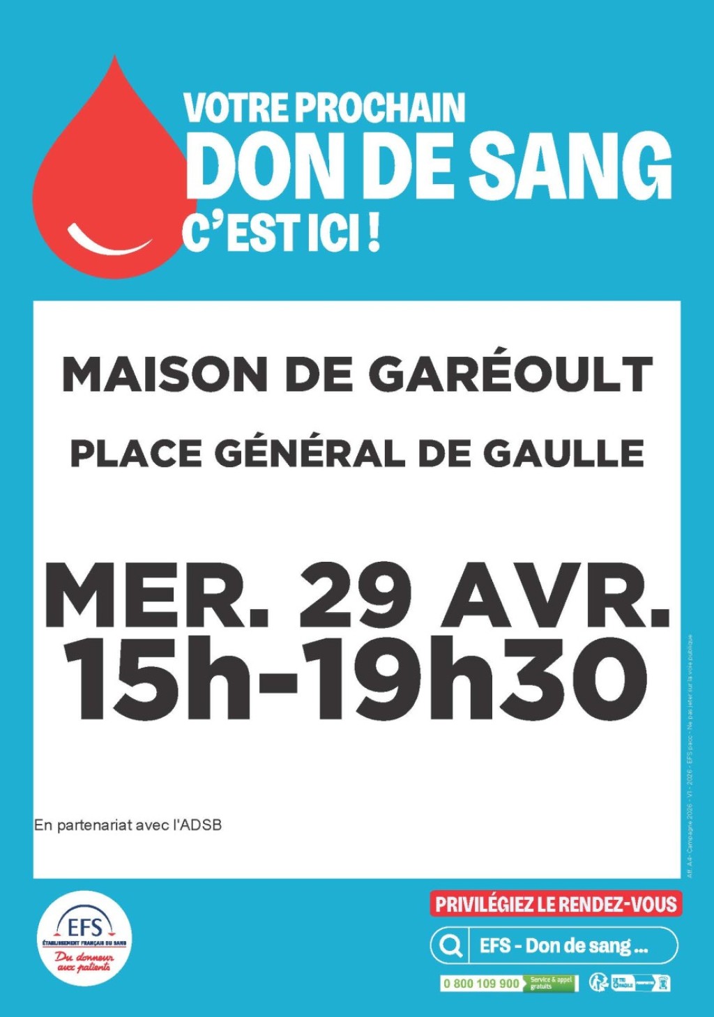 “ Votre prochain don de sang, c'est ici ! En partenariat avec l'ADSB. ”