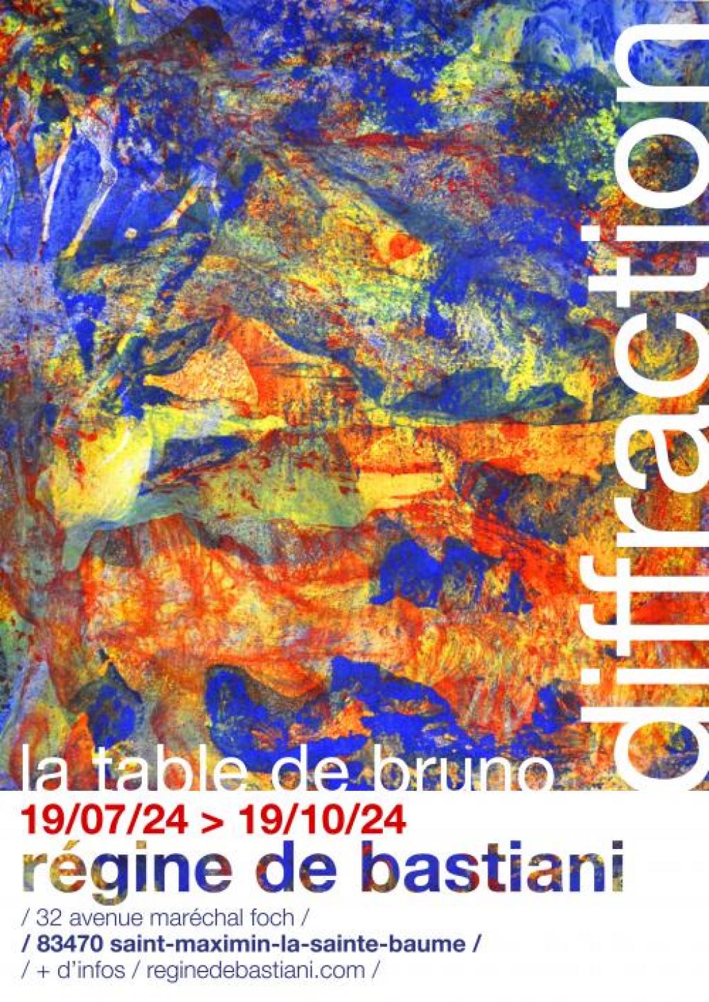 “ Régine de Bastiani investit les murs de la salle du restaurant avec la série "sujet éruptif", série de peintures réalisée sur du papier, marouflé sur toile. dans ce travail, la peinture exprime sa capacité de diffraction de la lumière. ”