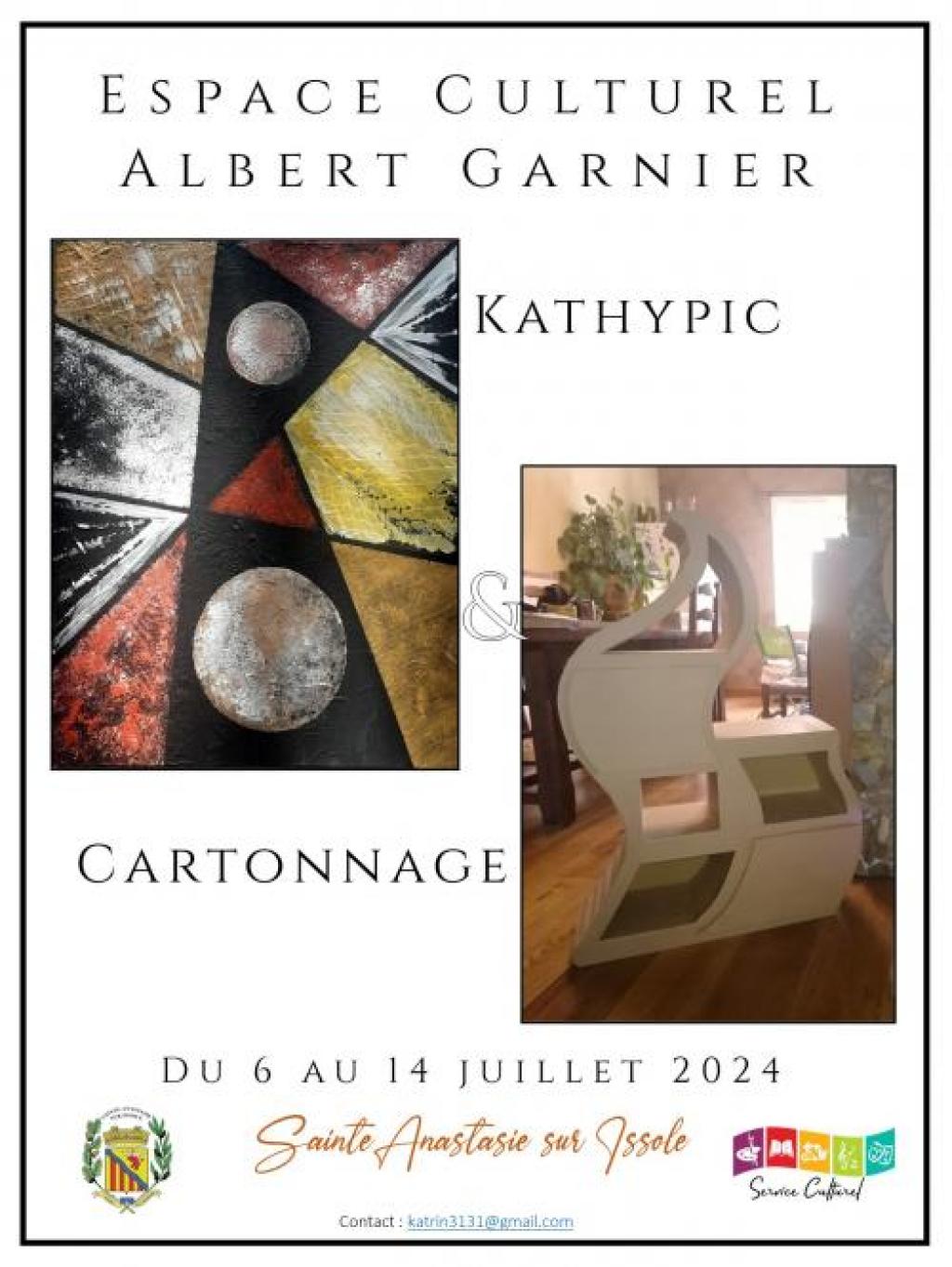 “ Madame Piquet et Monsieur Messina vous présentent leur expositions de peintures et d'objet en cartonnage. Vernissage le 6 juillet à 18h30. ”