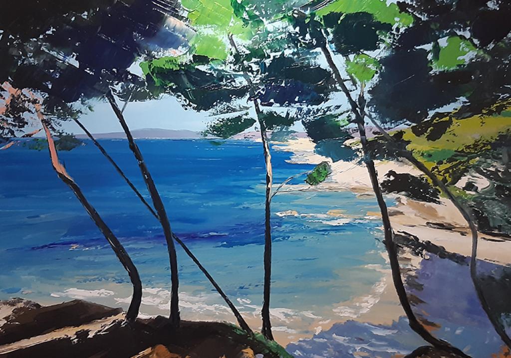 “ Très inspirée par la côte varoise et la Méditerranée, cette artiste-peintre joue avec une palette de couleurs étincelantes. À l’huile au couteau sur toile, sa peinture est ensoleillée et chaleureuse avec un style figuratif contemporain. ”