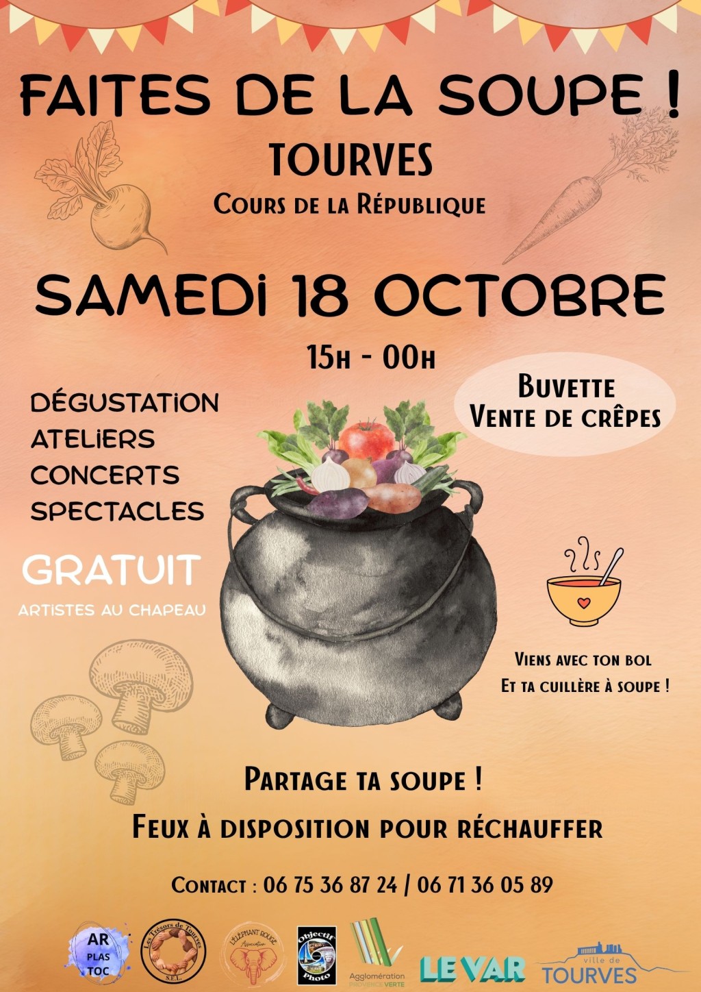 “ Les associations L'Eléphant Rouge, Les Trésors de Tourves et Arplastoc, soutenues par la Mairie de Tourves, vous invitent à la 3e édition de la Faites de la soupe. ”