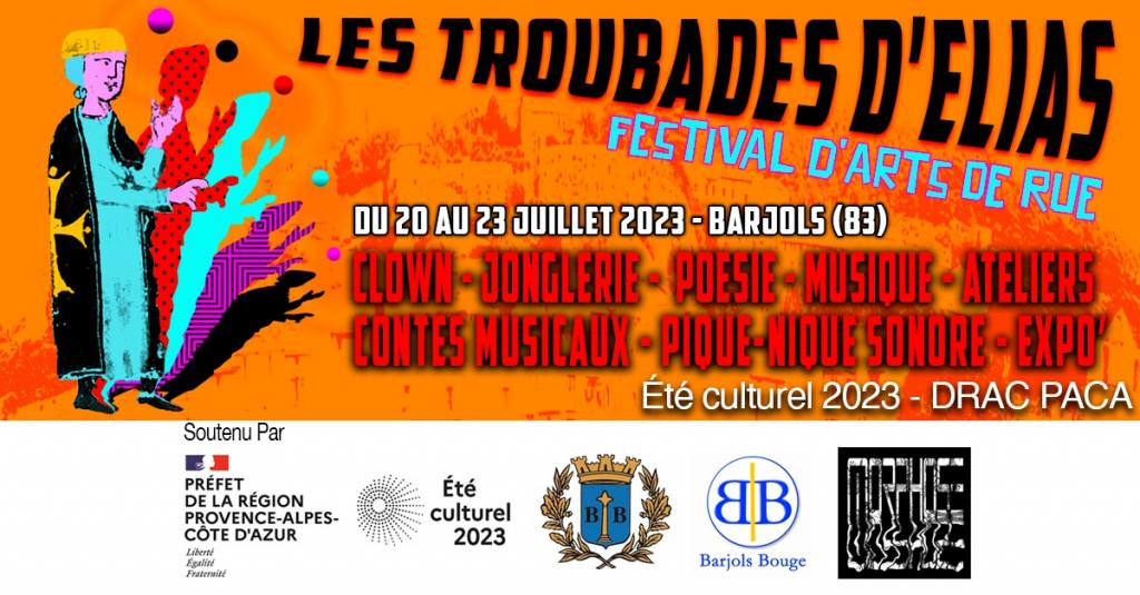 C'est grâce au travail d'une équipe très motivée qu'on vous propose la première édition du tout premier festival d'arts de rue à Barjols "Les Troubades d'Elias" qui vise à faire vivre le village de Barjols sur une durée de 4 jours au travers de l’expression de différents arts de rue et à la mémoire d'un personnage emblématique de Barjols.