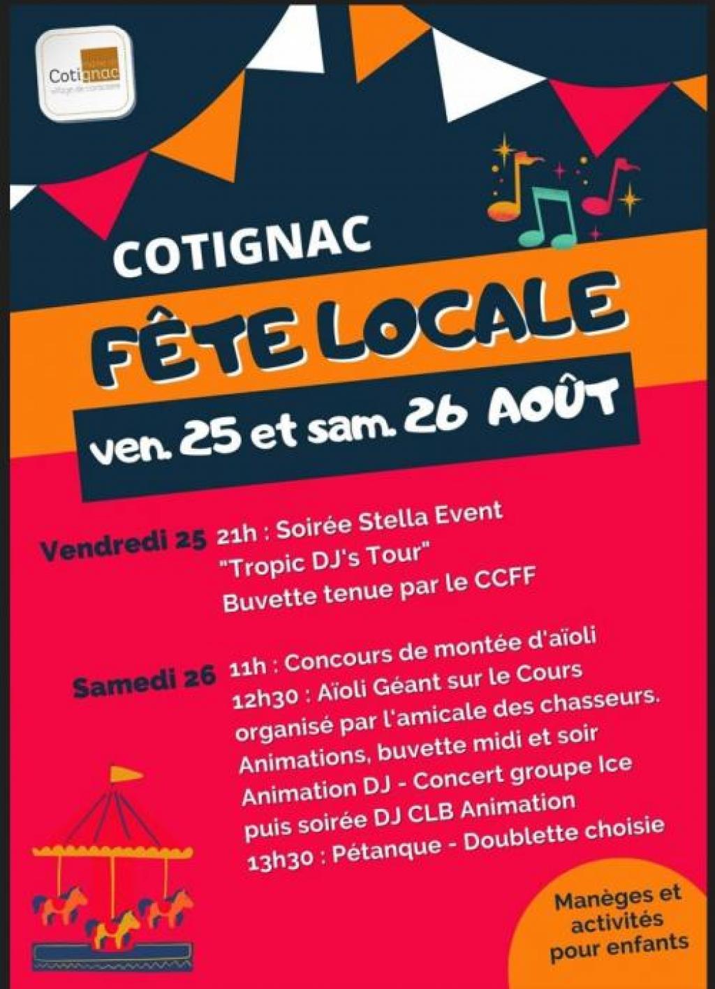 “ Au village en journée et soirée, organisée par la municipalité et les associations - manèges, concours d'aïoli et animations musicales. ”