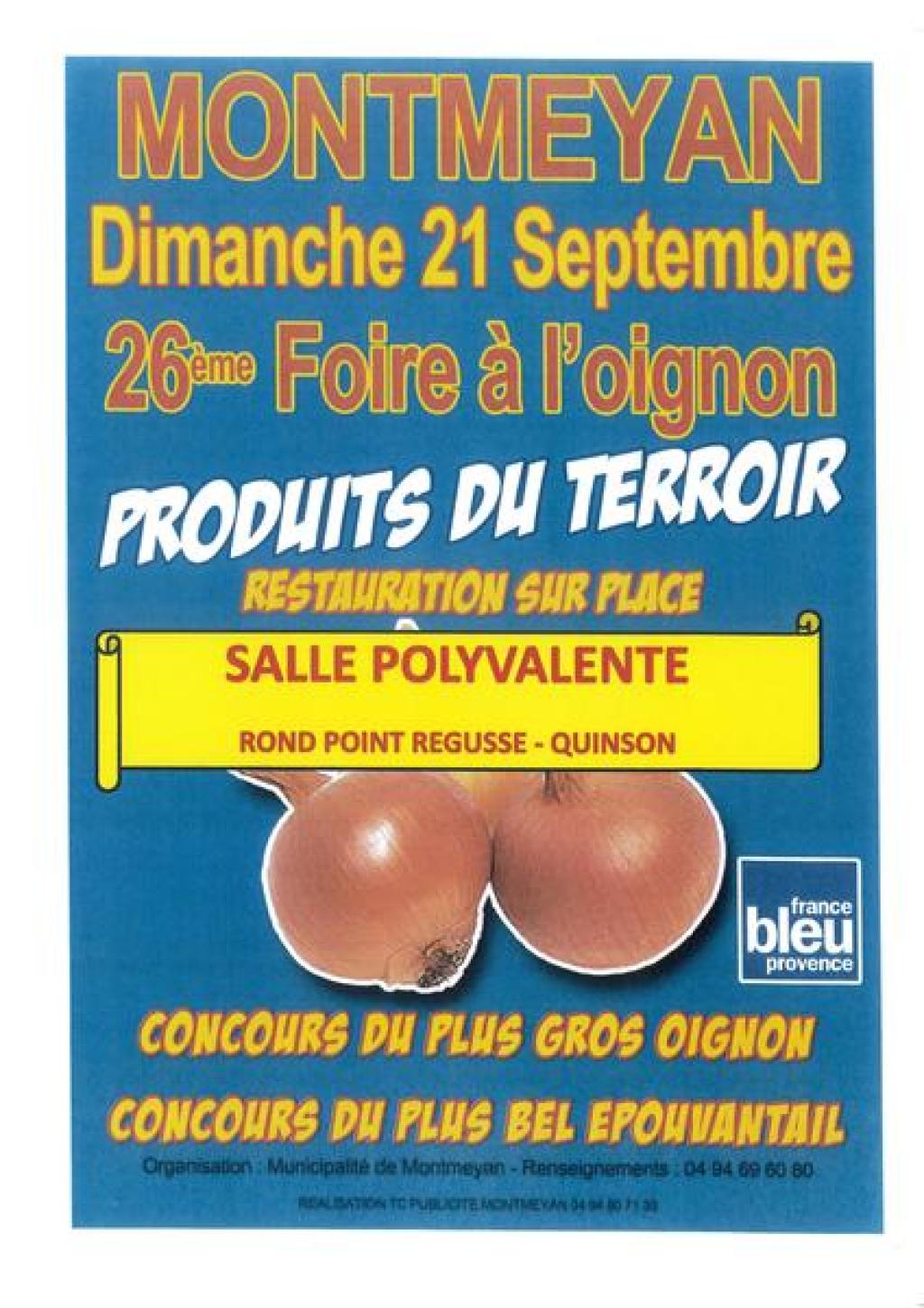“ 26 ème édition. Montmeyan célèbre l’oignon, symbole de la commune, le troisième dimanche de septembre. Une foire paysanne s’installe pour l’occasion, avec concours du plus gros oignon et d’épouvantails, pissaladière géante et diverses animations ”