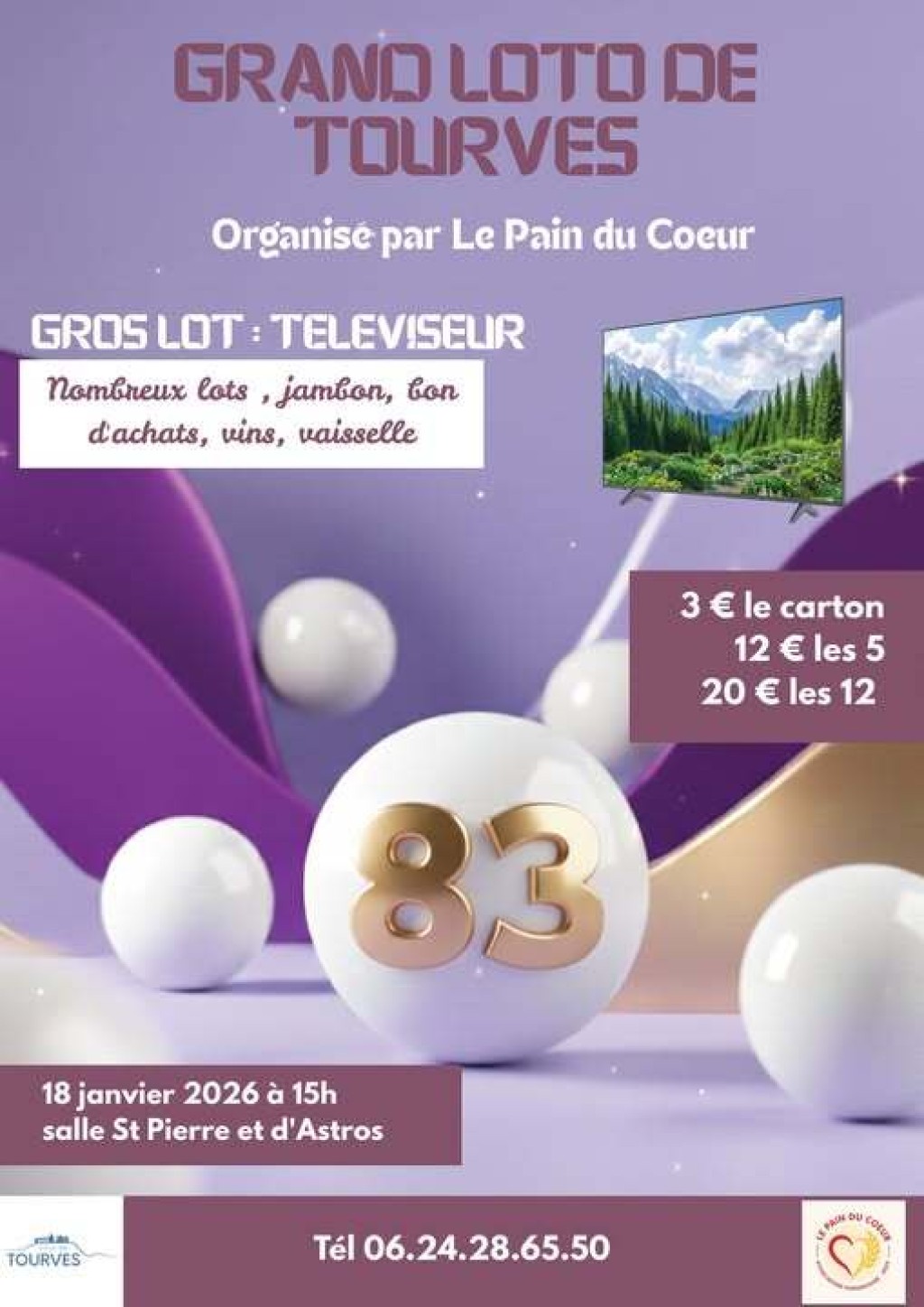 “ Un loto organisé par Le Pain du Cœur. De nombreux lots à gagner : vins, vaisselle, bon d'achats, ”