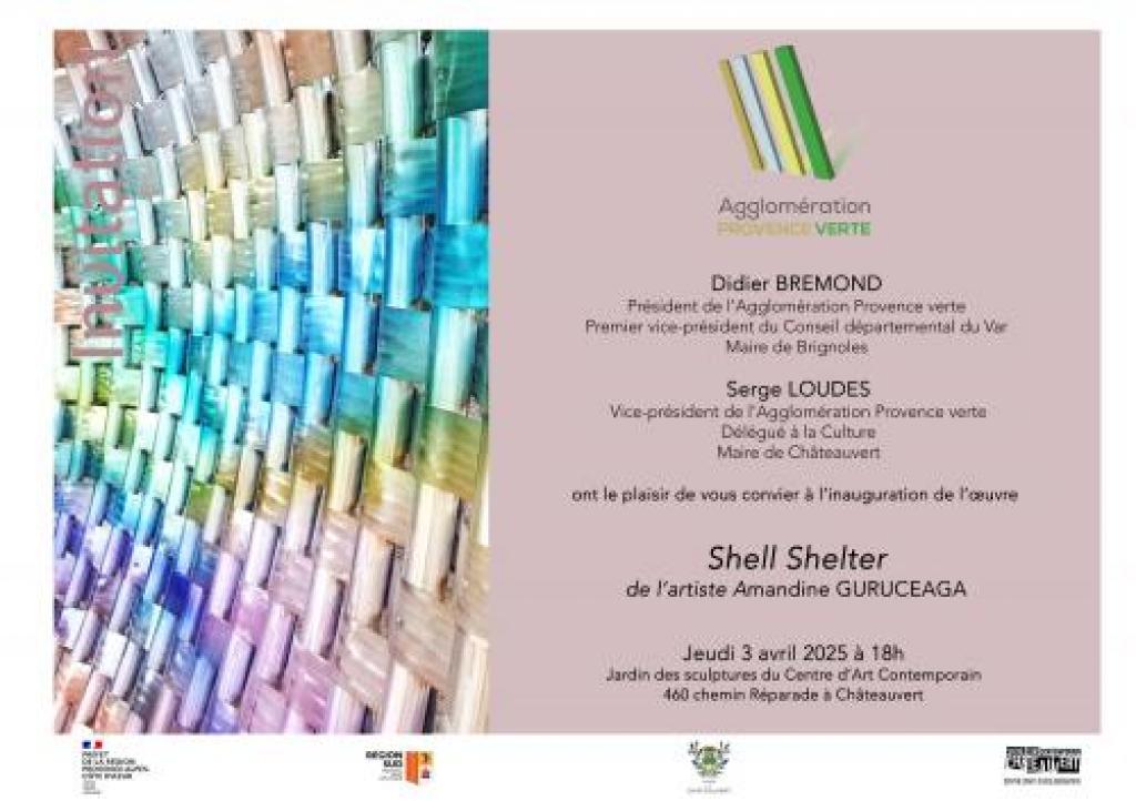 “ L'Agglomération Provence Verte et le centre d'art contemporain de Châteauvert ont le plaisir de vous inviter à l'inauguration de l'œuvre Shell Shelter d'Amandine Guruceaga, dernière œuvre acquise pour le jardin de sculptures ”