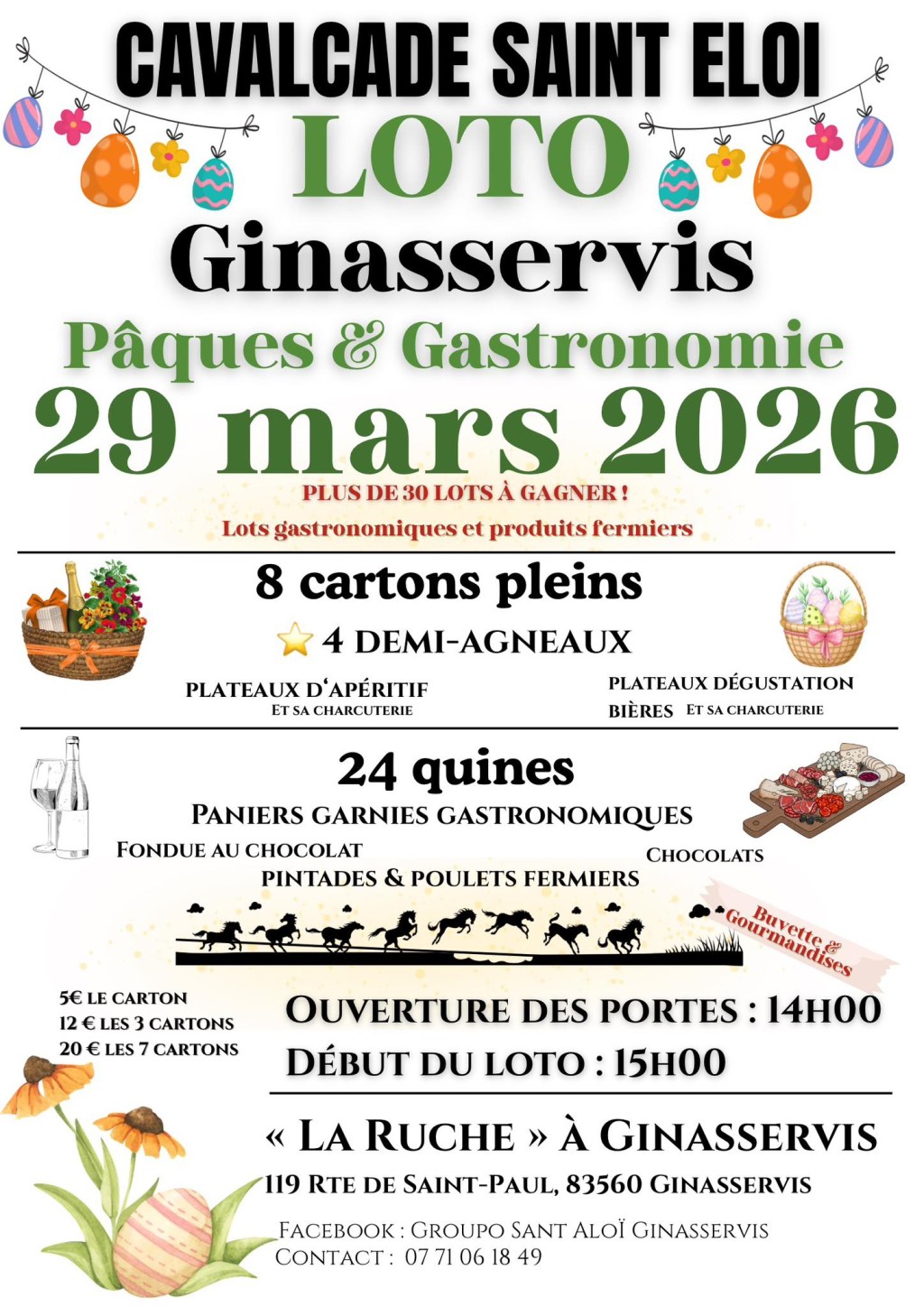 “ 8 cartons pleins, 24 quines. Plus de 30 lots à gagner : paniers garnis gastronomiques, plateaux dégustations, ... 4 demi-agneaux locaux, 2 jambons crus de 5kg , 8 pintades & 8 poulets fermiers locaux, 2 rosettes de 1kg. ”