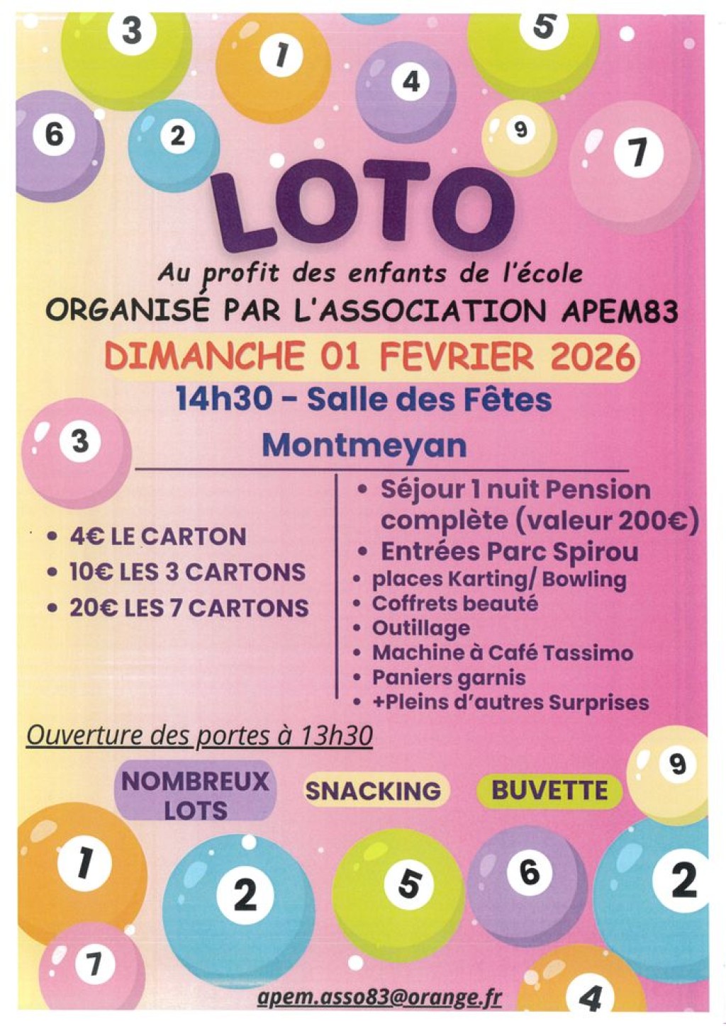 “ Un loto organisé au profit des enfants de l'école par l'association APEM 83. Snacking et buvette sur place. De nombreux lots à gagner : séjour, entrées Parc Spirou, machine à café tassimo et bien d'autres encore. ”