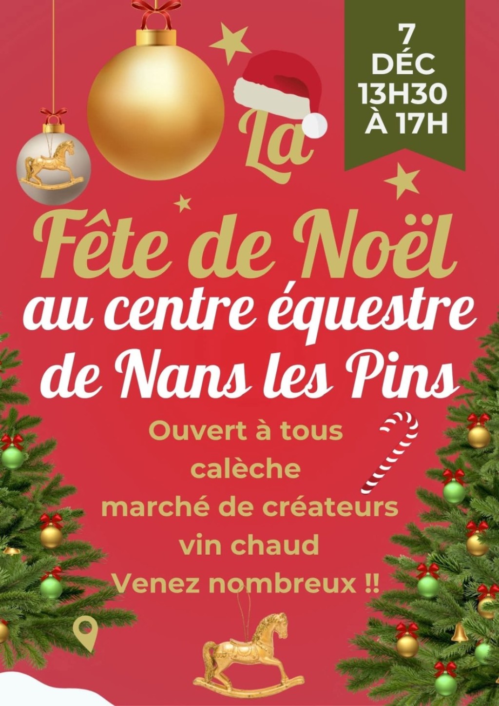 “ Venez nombreux vous amuser et vous mettre dans l'ambiance de Noël. Marché des créateurs, idées cadeaux, balades en calèches, vin chaud. ”