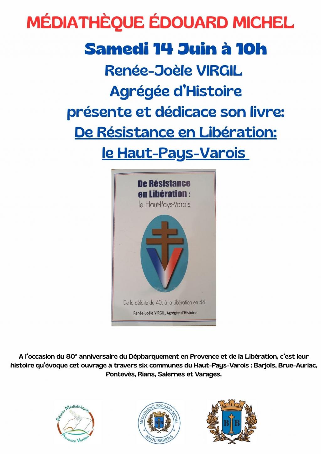 “ A l'occasion des 80 ans du débarquement, la médiathèque vous invite à la présentation et dédicace du livre "De Résistance en Libération : Le Haut-Pays-Varois" De Renée-Joèle VIRGIL, professeure agrée d'histoire. ”
