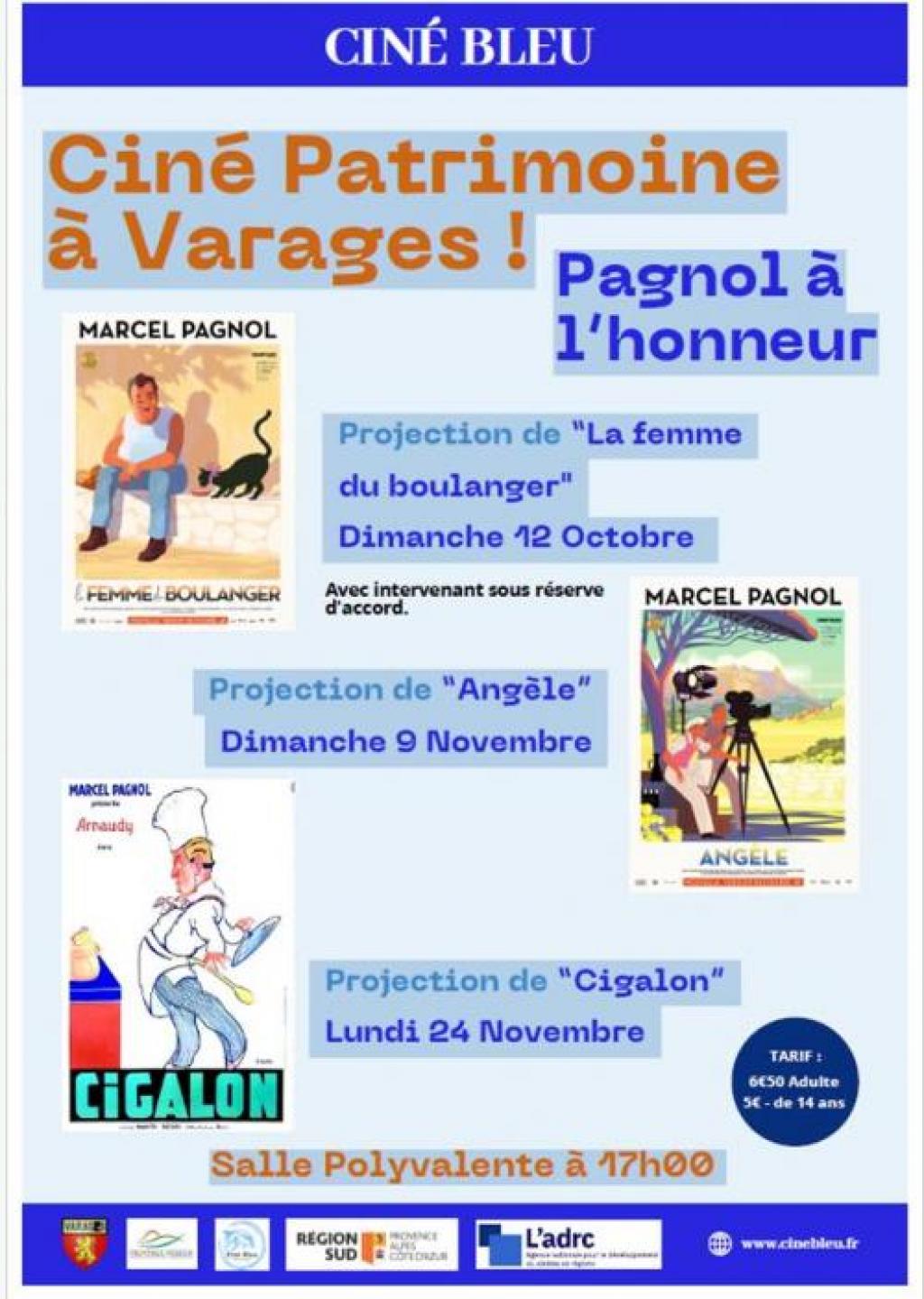 “ La commune de Varages et Ciné bleu rendent hommage au cinéaste écrivain Pagnol en diffusant 3 adaptations incontournables de ses œuvres. ”