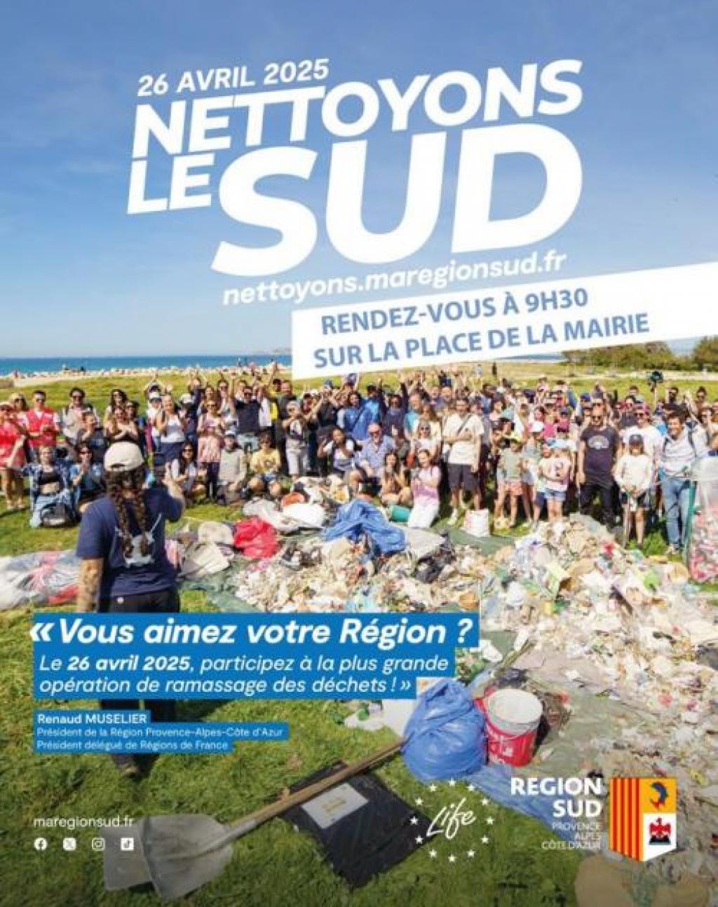“ Nettoyons le Sud, c'est la grande journée de ramassage qui réunit les communes, associations et citoyens de la région Sud. L'année dernière, plus de 85 tonnes de déchets ont été collectés. Cette année, relevons le défi et ensemble, nettoyons le Sud ”