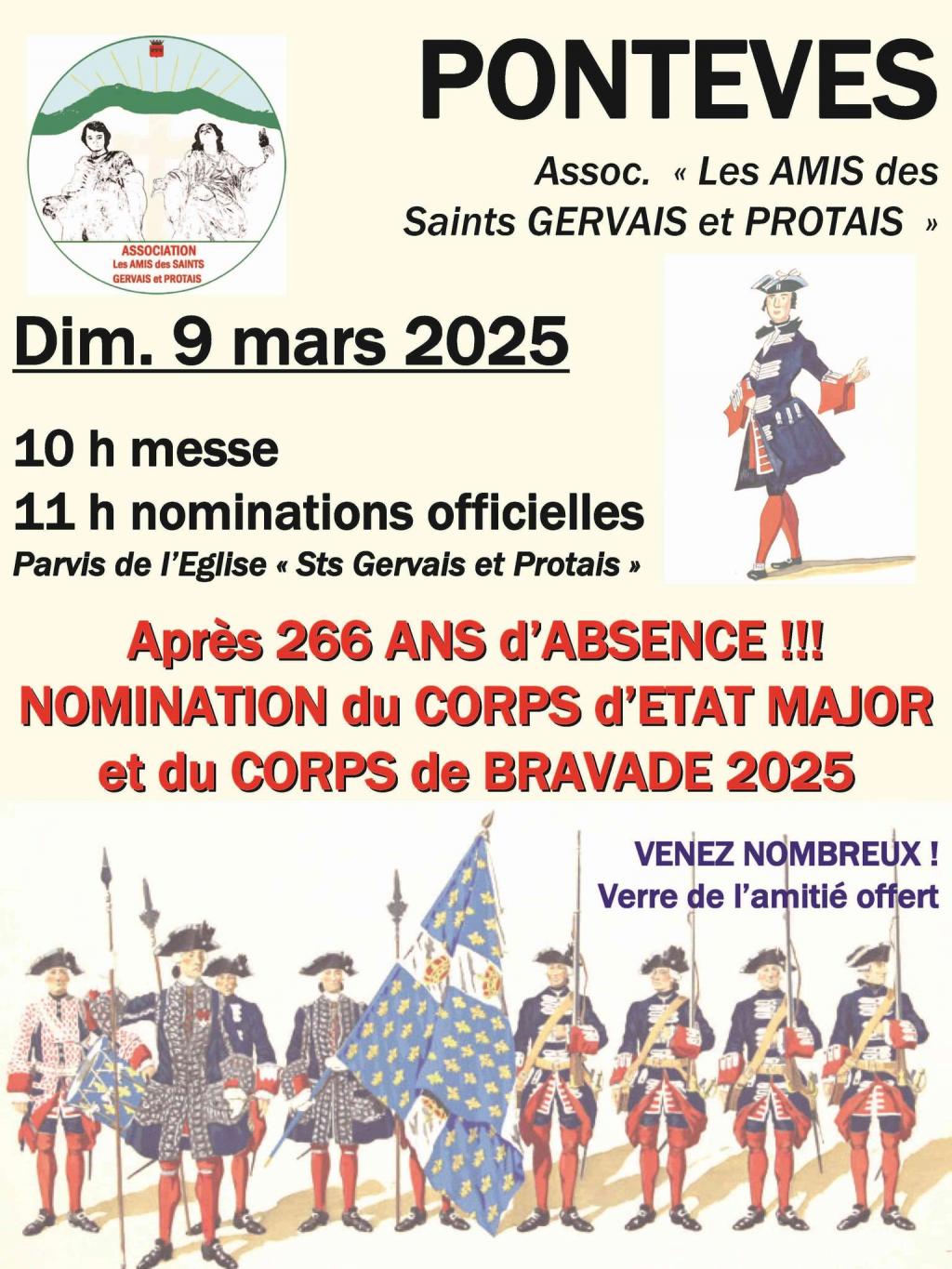 “ En vue de la reconstitution historique de la bravade pontoise (XVIIe s.) pour la prochaine fête patronale et après 266 ans d'absence au village, nous avons le plaisir de vous annoncer la nomination du Corps d'Etat Major et du Corps de Bravade 2025. ”