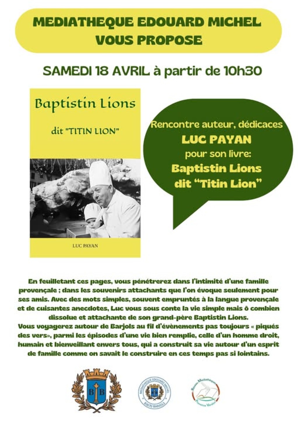 “ La Médiathèque Edouard Michel vous invite à une rencontre avec Luc Payan à l’occasion de la sortie de son ouvrage Baptistin Lions dit « Tintin lion ». L’auteur sera présent pour échanger avec vous et dédicacer son livre ”