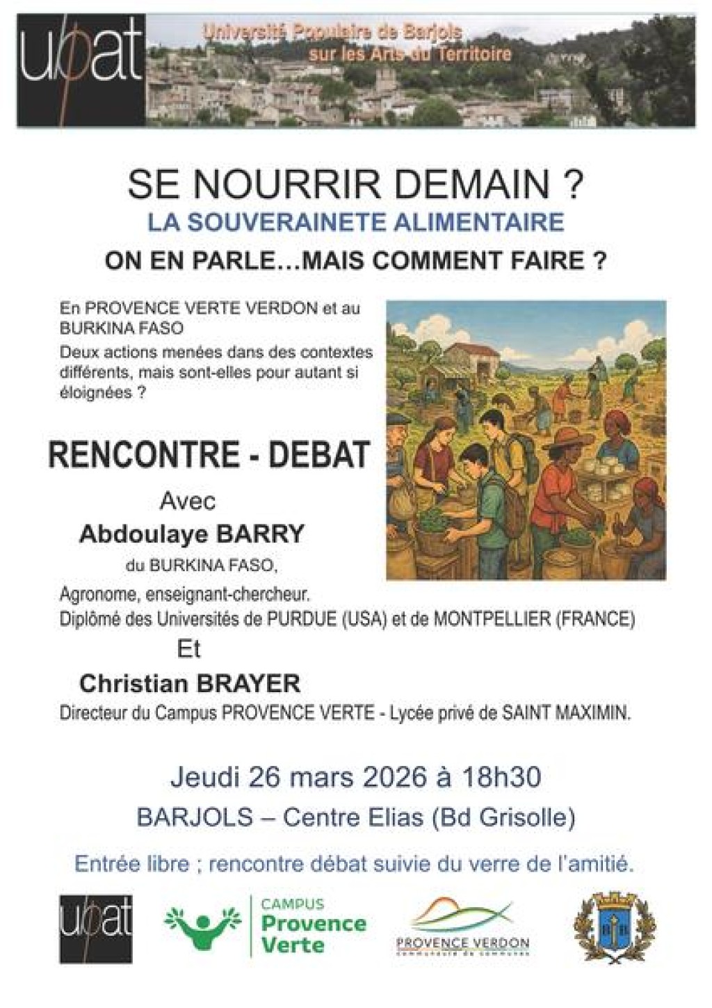 “ L’objectif est de débattre à partir de 2 situations concrètes : l’une située sur notre territoire de la Provence Verte - Verdon et l’autre dans un pays sahélien : le Burkina Faso, des enjeux de la souveraineté alimentaire et des moyens d’y parvenir. ”