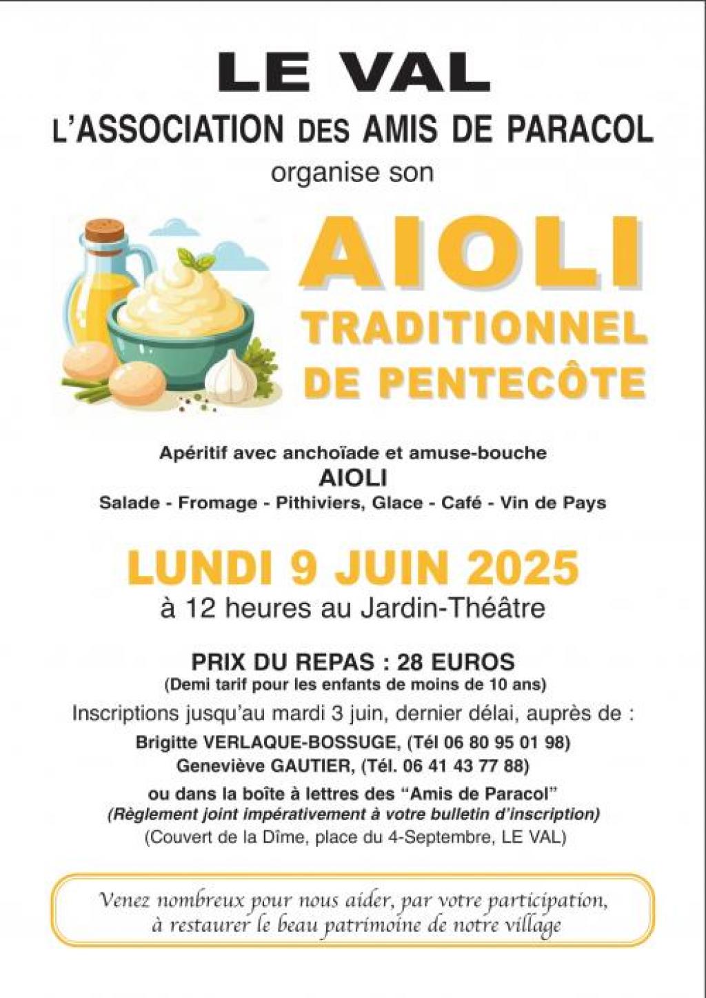 “ Le traditionnel Aïoli de la Pentecôte vous est proposé. Au menu : Apéritif avec anchoïade et amuse-bouche, AÏoli, Salade, fromage , Pithiviers, Glace, Café, Vin de Pays ”