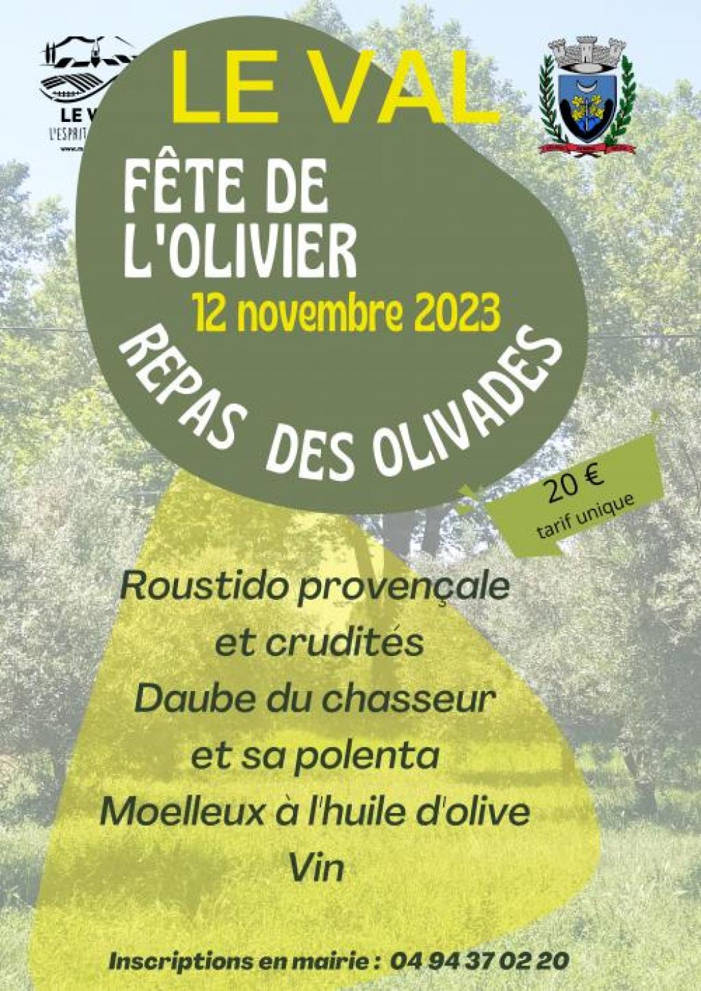 “ Dans le cadre de la Fête de l'Olivier, un repas vous est proposé : Roustido provençale et crudités, Daube du chasseur et sa polenta, moelleux à l'huile d'olive et vin ”