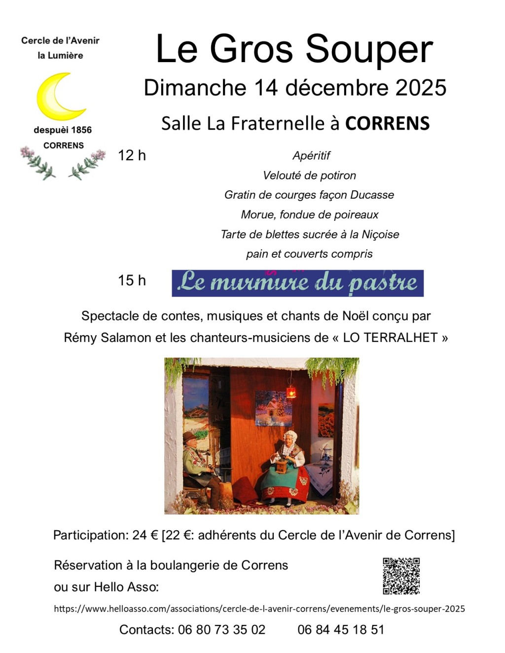 “ le traditionnel gros souper vous est proposé. Au menu : Apéritif, gratin de courge façon Ducasse, morue, fondue de poireaux, tarte de blettes sucrée à la niçoise, pain et couverts compris ”