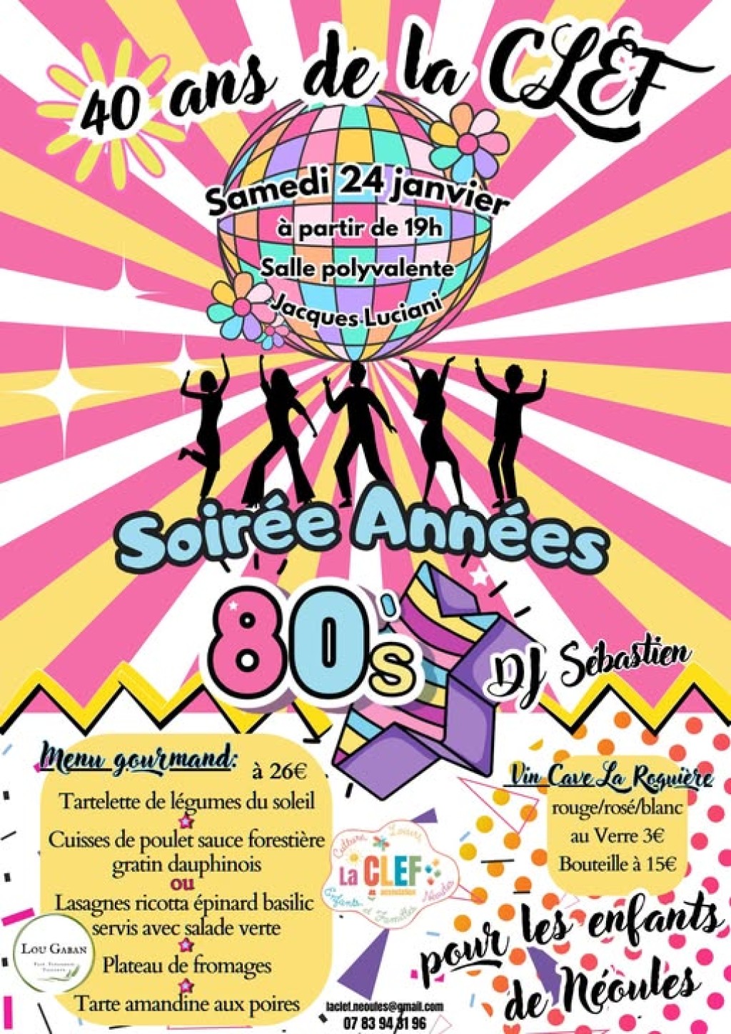 “ 40 ans ce mois ci que notre association a vu le jour 40 ans que le cœur de cette association bat pour les enfants de notre village. En partenariat avec la Commune de Néoules nous organisons une soirée dansante années 80 pour fêter ça ”