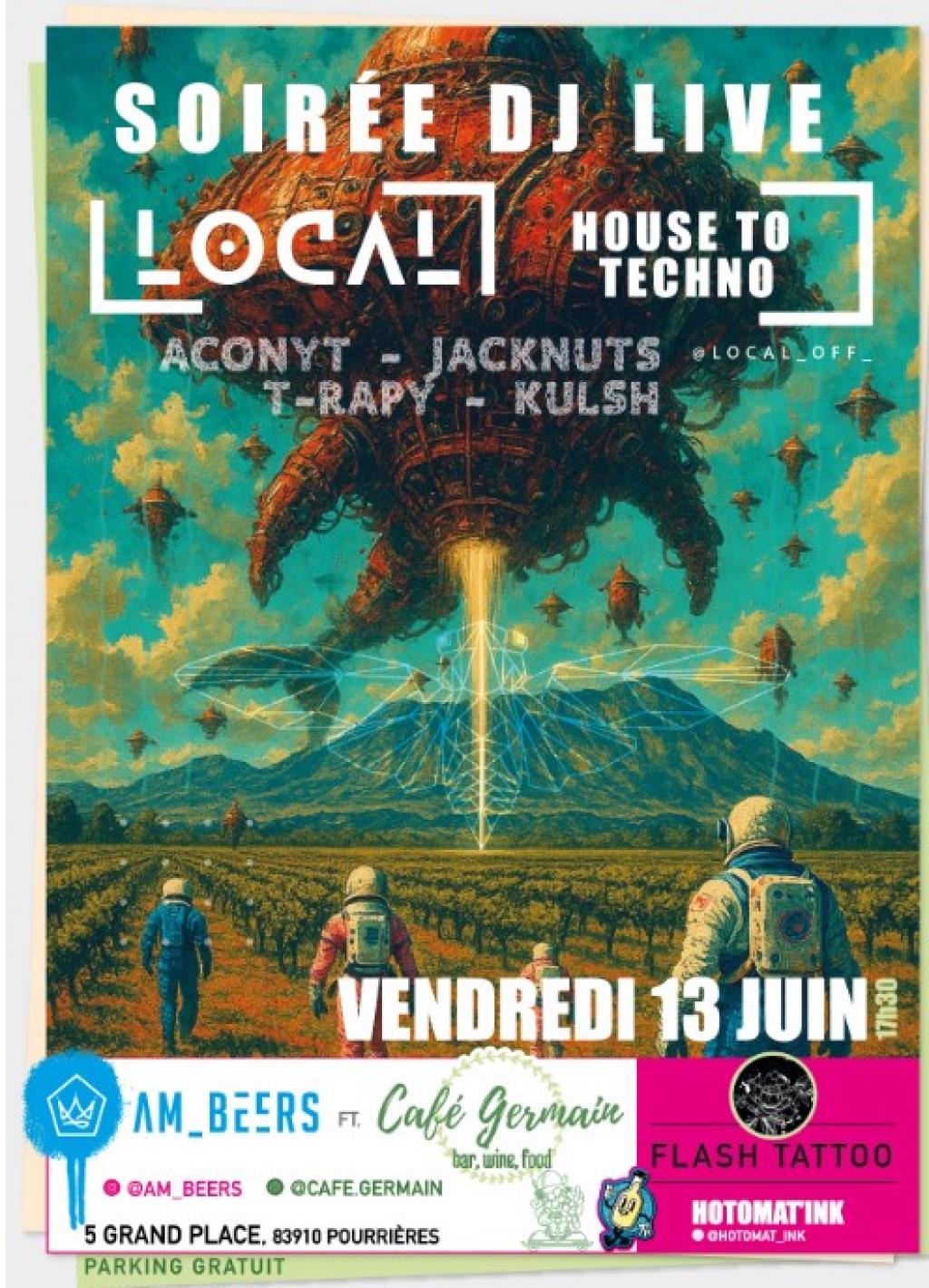 “ Une soirée en collab’ avec le Café Germain, en musique avec la Team LOCAL : T-RAPY • KULSH • ACONYT • JACKNUTS local_off ! Les flash Tattoo : Hotomat'ink Tattoo et tapas et vins sur place. ”