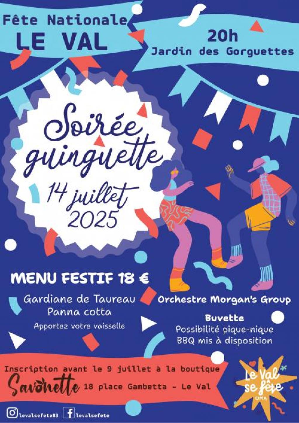 “ Animation musicale par l'orchestre Morgan's Group et repas (sur réservation). N'oubliez pas vos couverts, verres et assiettes. Possibilité de pique niquer (barbecue à disposition) ”