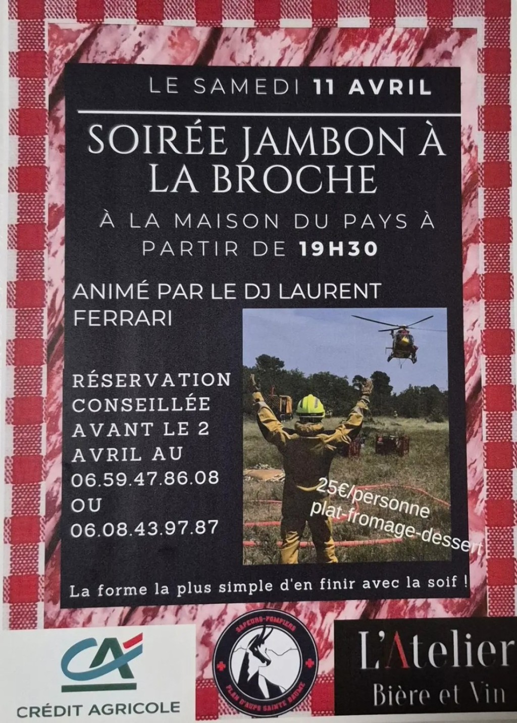 “ Un repas jambon à la broche convivial pour le plat suivi du fromage et d'un dessert. La soirée est animée par le DJ Laurent FERRARI. ”