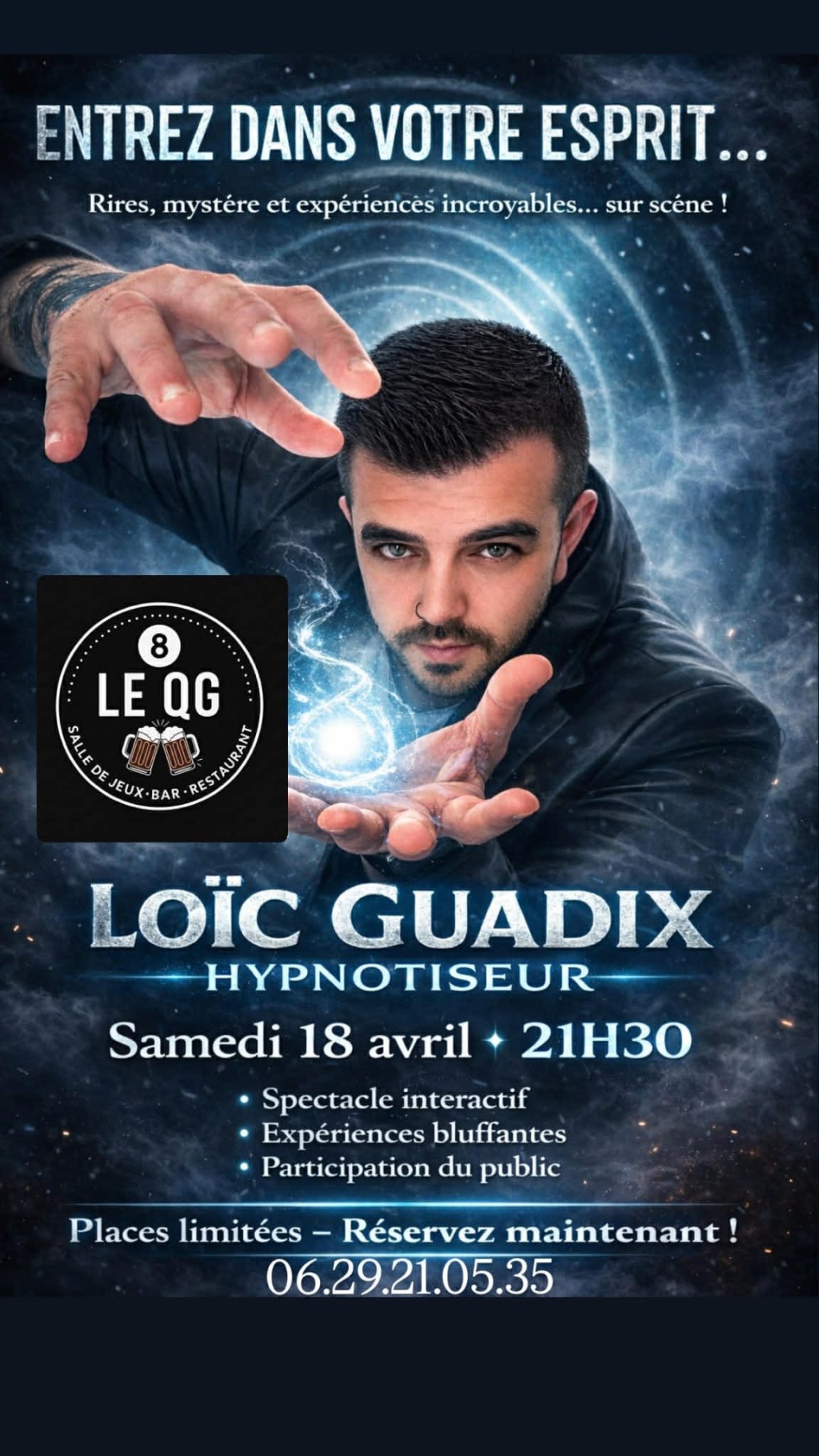 “ Rendez-vous au QG pour un spectacle d'hypnose interactif avec Loic Guadix. Participation du public et expériences bluffantes au programme. Restauration sur place. Réservations conseillées. ”