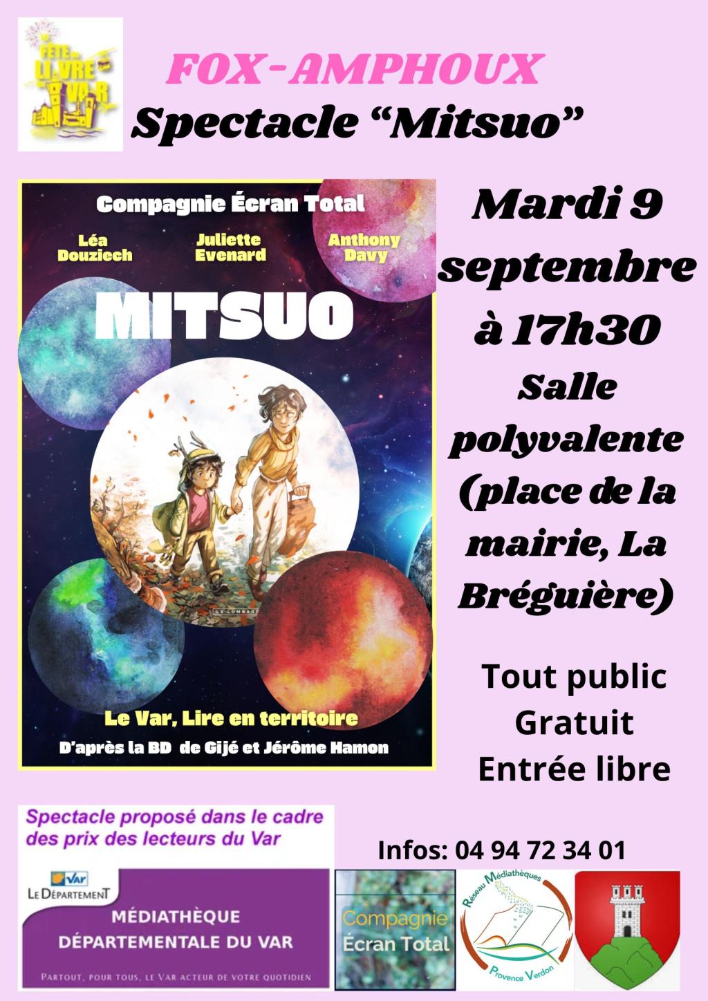 “ Un spectacle proposé dans le cadre de Lire en territoire et le Prix des lecteurs du Var. Il s'agit d'une mise en scène tendre et pleine d'humour de la BD Mitsu, proposée par la Cie Ecran Total. ”